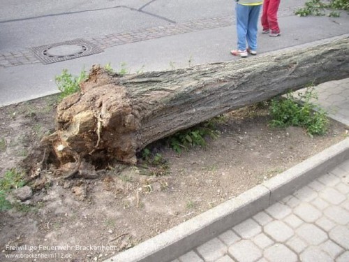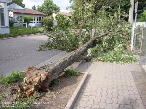 Lage: Durch heftige Winde wurde ein Baum vor dem Grundschulgebäude in Meimsheim entwurzelt und fiel dabei um. Der Bauhofleiter forderte die Feuerwehr zur Entfernung des umgestürzten Baumes an.