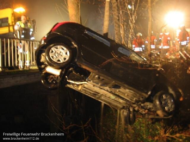 Lage: Ein PKW mit 3 Insassen kam im Bereich der Brücke von der Fahrbahn ab und fuhr dabei in die Zaber. Die Insassen konnten sich selbst aus dem im Wasser liegenden PKW retten und mussten zum Teil vom Rettungsdienst versorgt werden.
