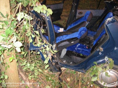 Die anschließende Befreiung der eingeklemmten Person gestaltete sich kompliziert, da im Bereich der Fahrer-A-Säule durch den Baum kaum Platz war. So wurde im Wechsel von der Fahrer- und Beifahrerseite der Fußraum unter Verwendung von hydraulischen Stempeln vorsichtig vergrößert. Schliesslich konnten beide Fahrersitzscharniere durchtrennt und der Fahrersitz umgelegt werden. Jetzt wurde der schwer verletzten Fahrerin behutsam ein Spinboard untergeschoben. Mit Hilfe des Spinboards wurde sie dann aus dem verunfallten PKW nach hinten befreit und in den bereitstehenden Rettungswagen gebracht.