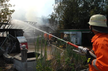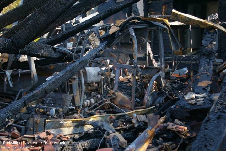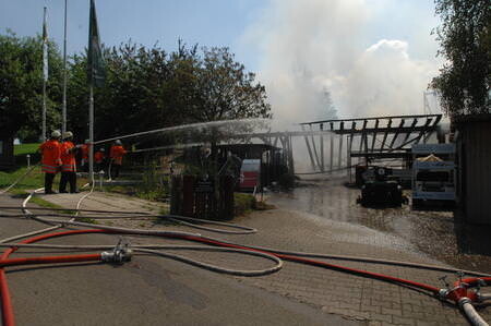 Beim Eintreffen der Feuerwehr brannte eine Maschinenhalle bereits vollständig. Durch die enorme Brandlast in der Halle schlugen die Flammen bis zu 30 Meter hoch aus dem Gebäude. Das Feuer hatte auch schon auf das Wohnhaus der Familie übergegriffen.