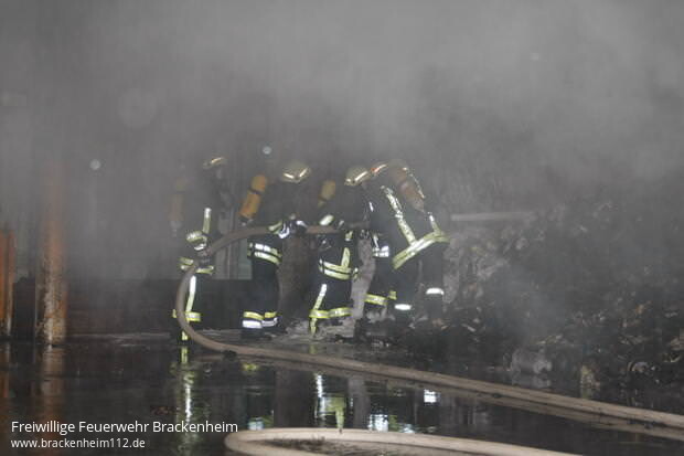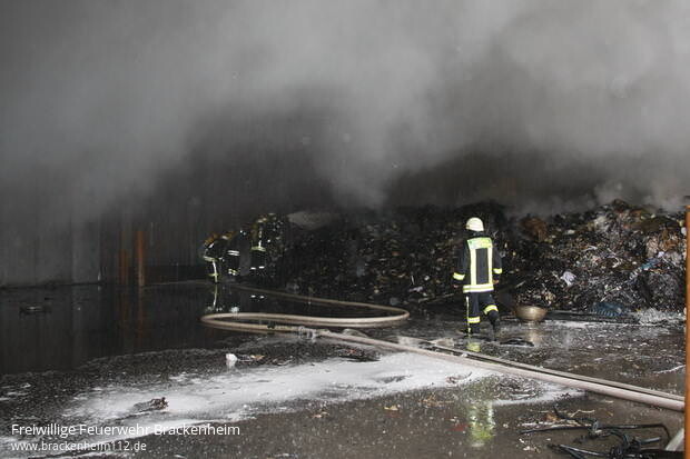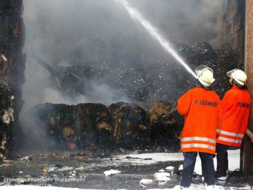 Nach etwa zwei Stunden war der Brand so weit unter Kontrolle, dass jetzt gezielt vorgegangen werden konnte, um die brennenden Ballen auszuräumen und abzulöschen. Dazu wurde der betroffene Hallenabschnitt mit Hilfe von mehreren Baggern ausgeräumt, das Material dabei abgelöscht, dann in Container verladen und auf einen Zwischenlagerplatz transportiert. Dort wurden von Feuerwehrkräfte bei Bedarf nachgelöscht.
