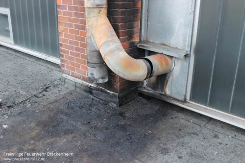 Beim Eintreffen an der Einsatzstelle waren an der Rückseite einer Industriehalle Flammen im unteren Bereich eines Abzugkamins zu erkennen, die gerade von einem Betriebsangehörigen mittels eines CO²-Löschers bekämpft wurden. Die weitere Erkundung ergab, dass es sich um einen Brand in einer Absauganlage und nicht um einen Kaminbrand handelte.
