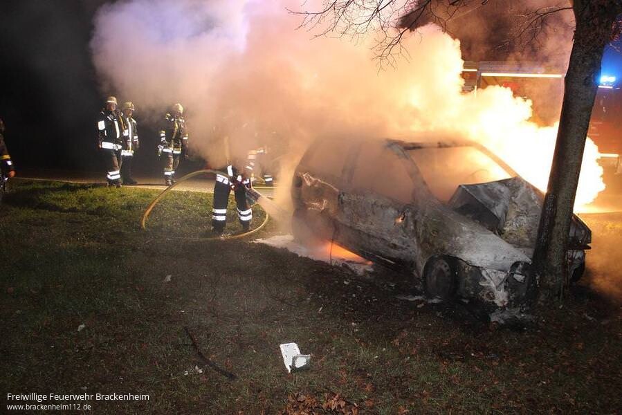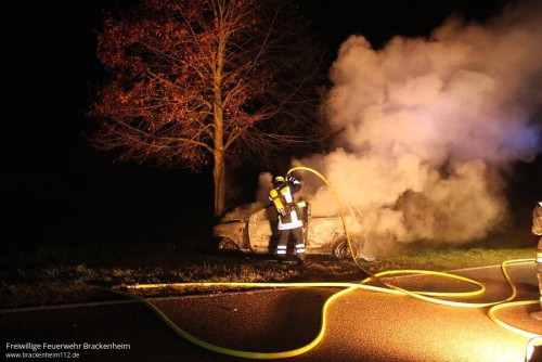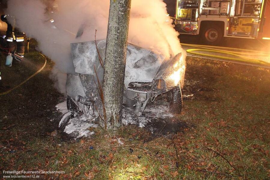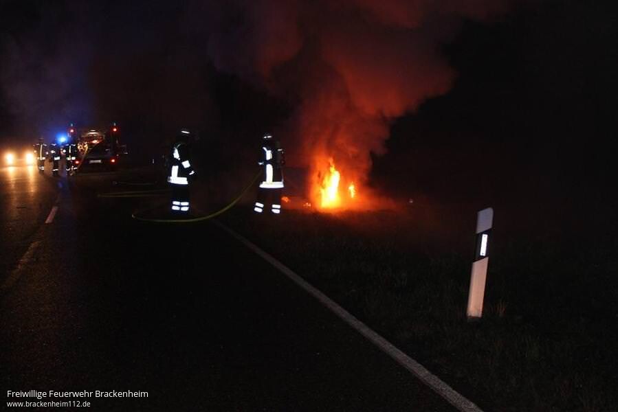 Beim Eintreffen an der Einsatzstelle stand das Fahrzeug bereits im Vollbrand. Die Fahrzeugführerin konnte sich glücklicherweise bereits aus dem Fahrzeug befreien und wurde vom Rettungsdienst betreut.