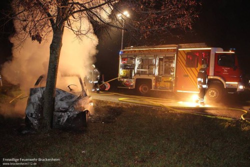 Von der ILS Heilbronn wurden wir am Donnerstagabend zu einem PKW-Brand auf der Landstraße zwischen Botenheim und Bönnigheim alarmiert. Ein PKW kam dort aus unbekannten Gründen von der Fahrbahn ab, prallte gegen einen Baum und fing Feuer.