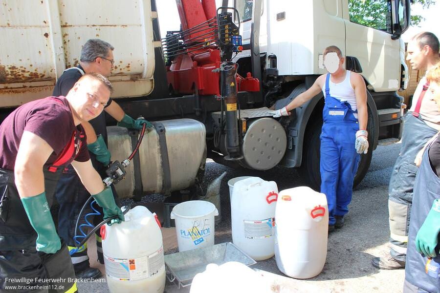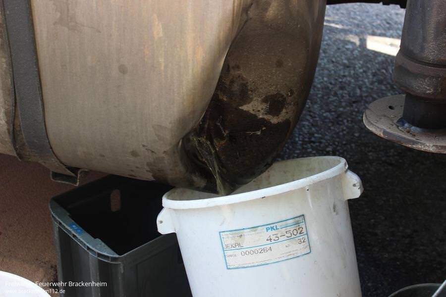 Beim Eintreffen waren bereits ca. 50 Liter aus dem beschädigten Tank ausgelaufen. Mit mehreren Kanistern wurde zunächst der weiter auslaufende Kraftstoff aufgefangen, bevor mittels einer Umfüllpumpe der Kraftstofftank vollständig leergepumpt werden konnte. Insgesamt konnten ca. 250 Liter Kraftstoff aufgenommen werden.