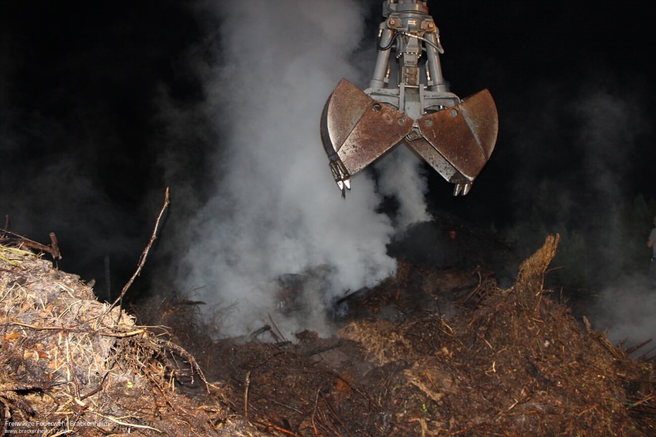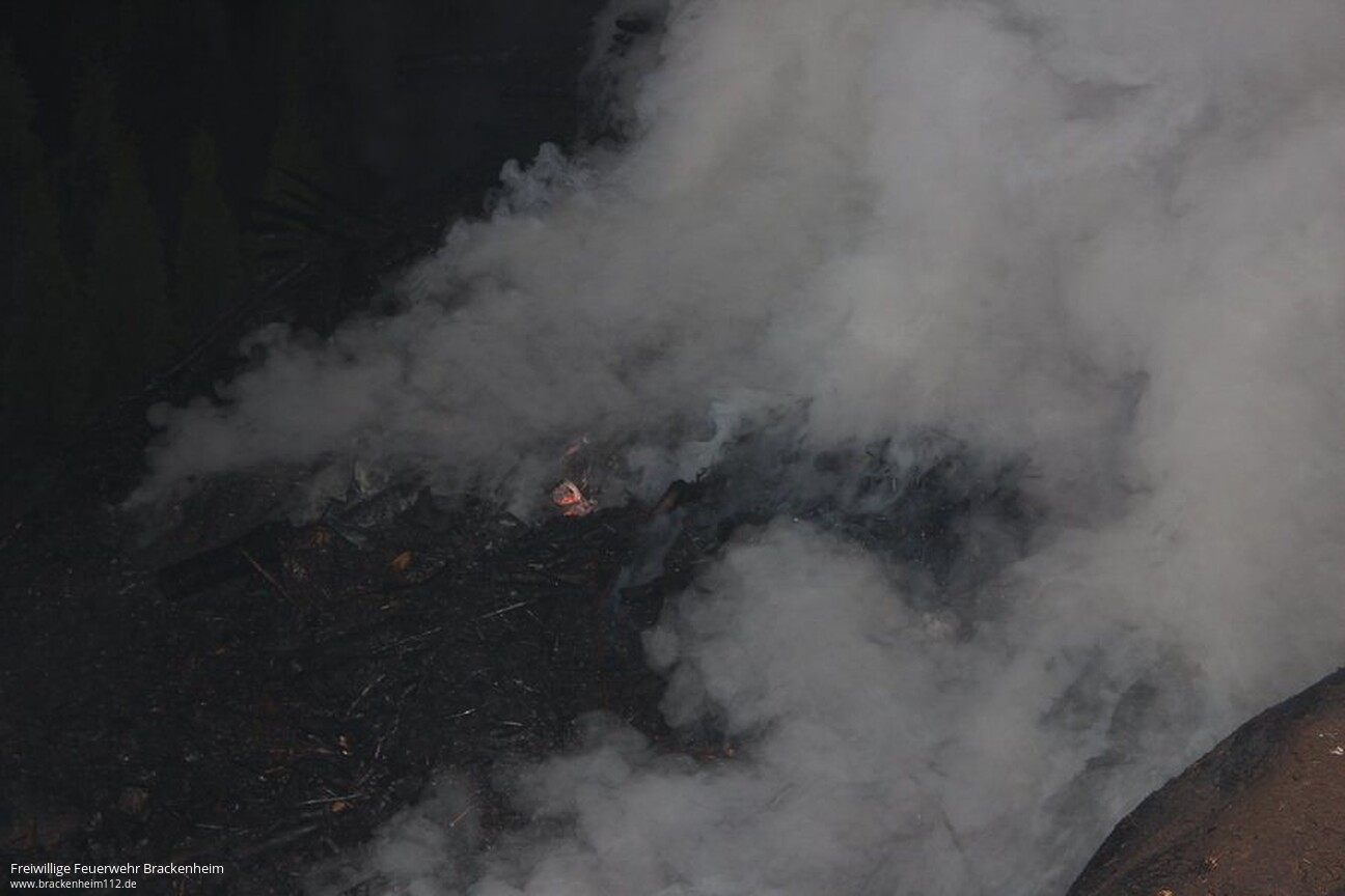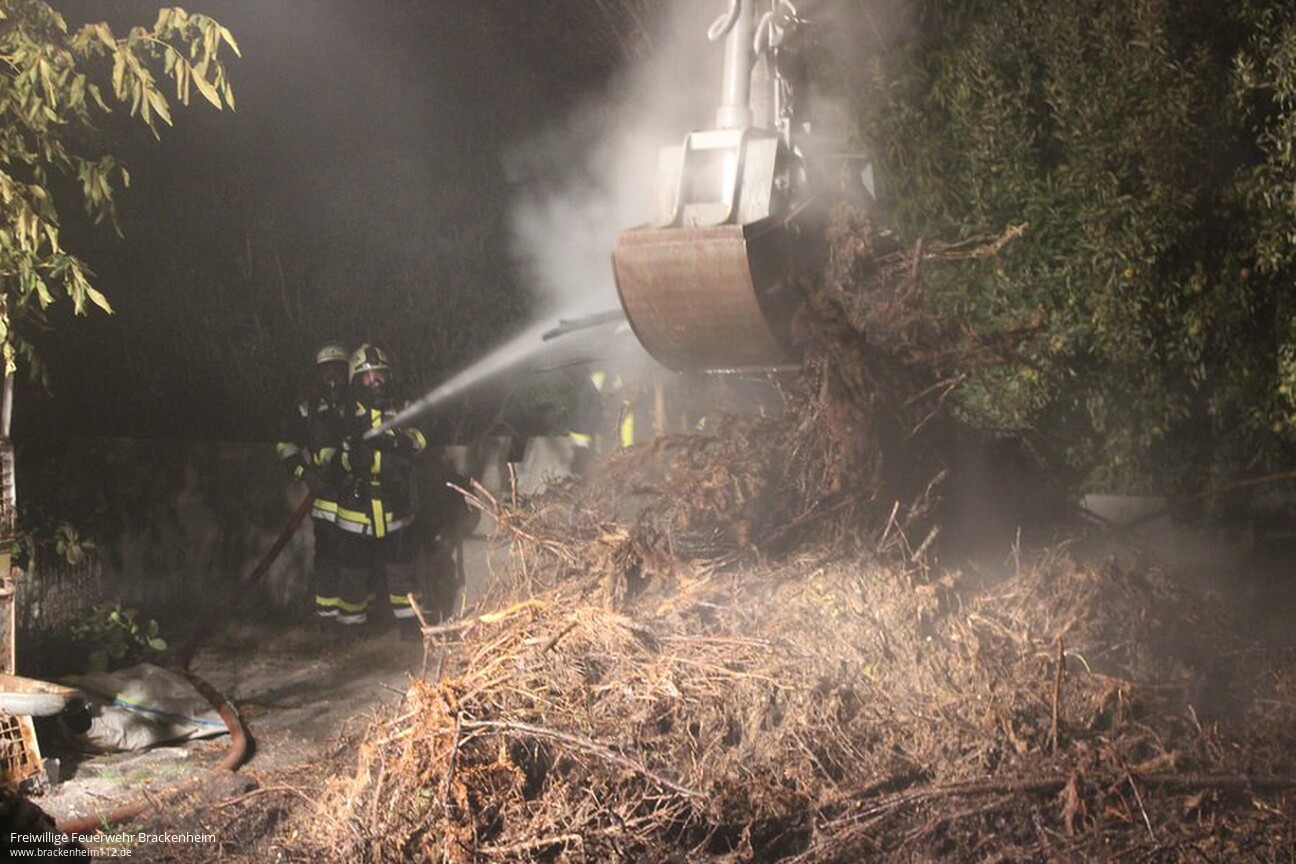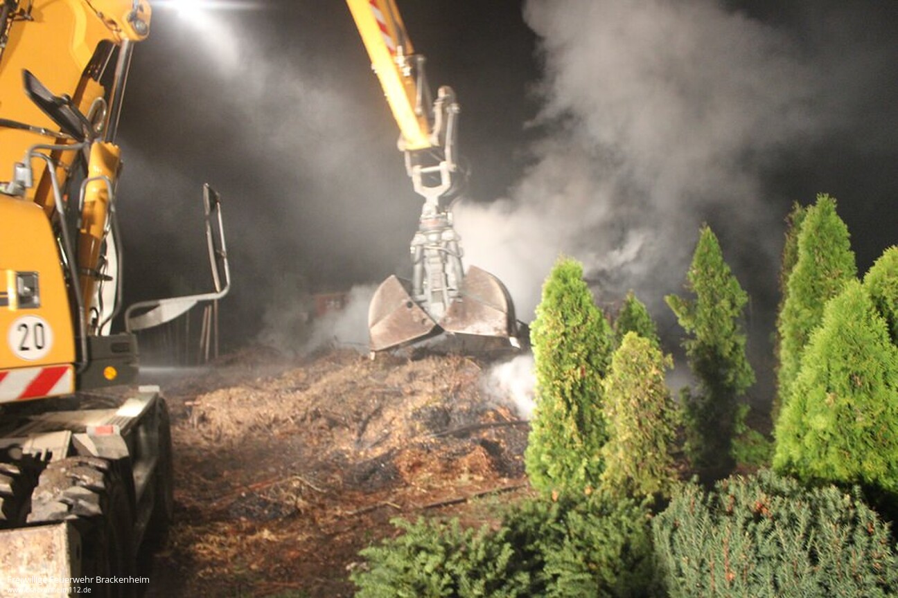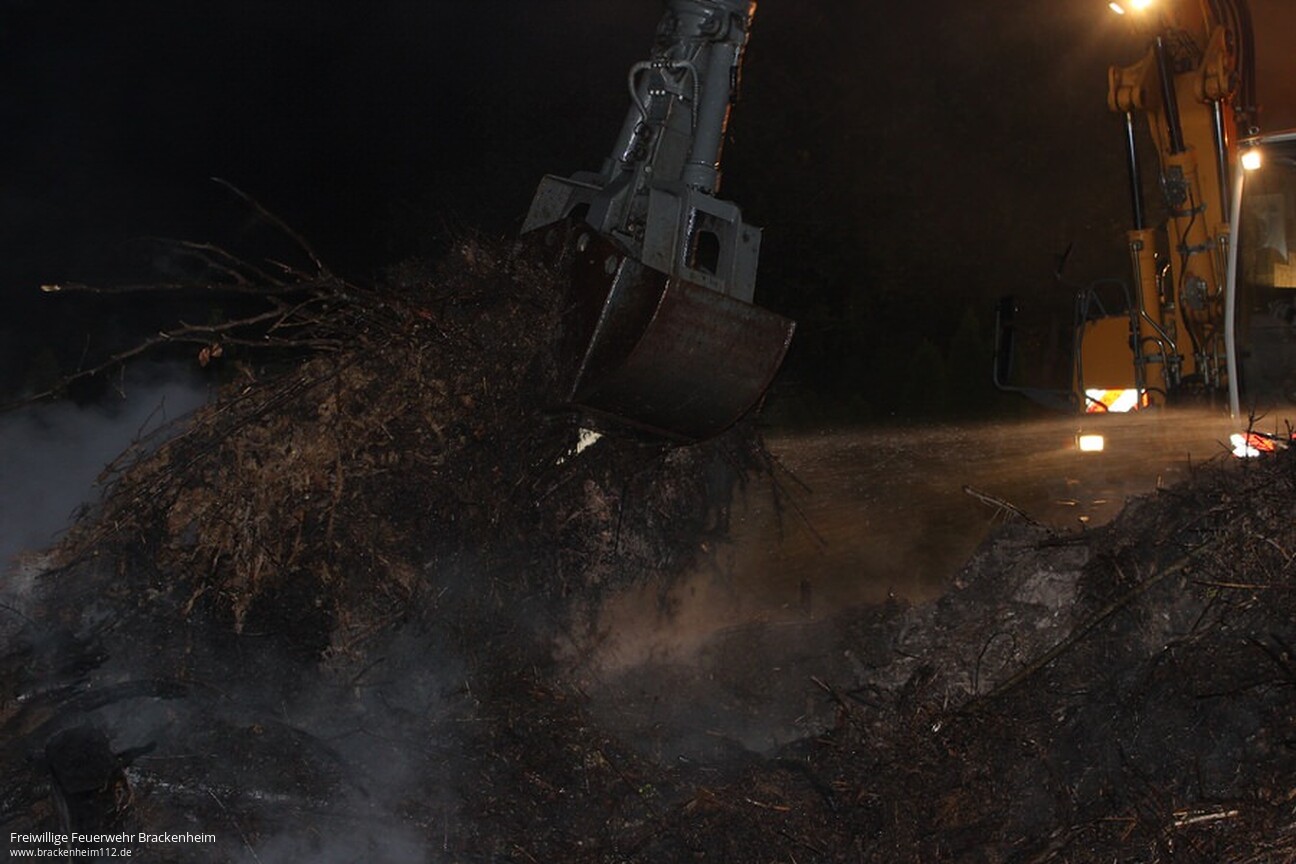 Um sämtliche Glutnester im Reisighaufen ablöschen zu können, wurde ein Bagger vom Bauhof der Stadt Brackenheim angefordert. Nach dem Eintreffen des Baggers konnte der Reisighaufen auseinander gezogen werden. Nachdem alle Glutnester abgelöscht waren, konnte der Einsatz um kurz nach drei Uhr in der Nacht wieder beendet werden.