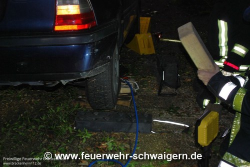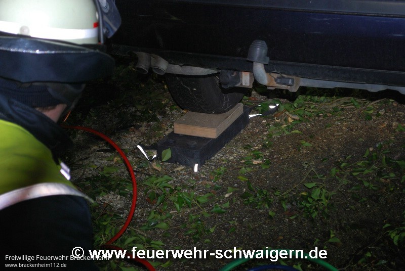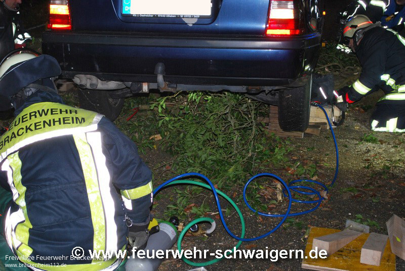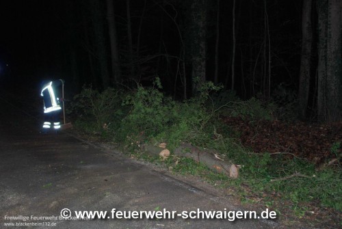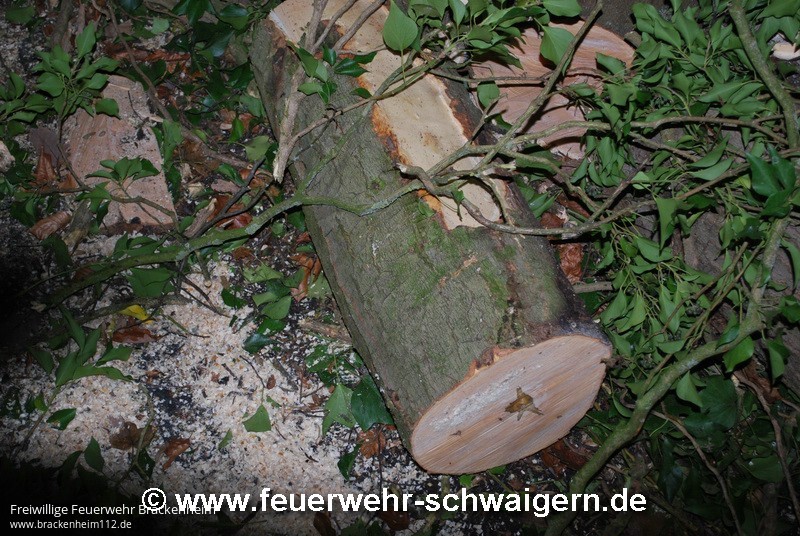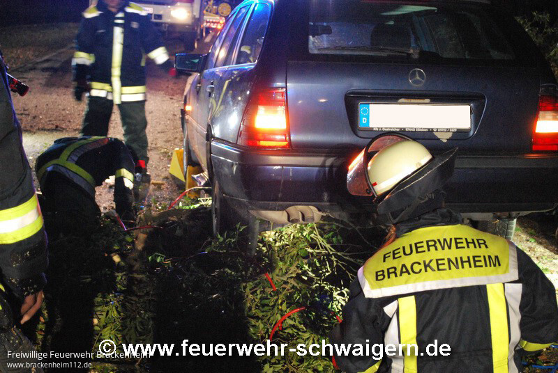 Unter dem Einsatzstichwort "K2151 - PKW schaukelt auf Baum" wurde die Feuerwehr alarmiert. Auf der Kreisstrasse Richtung Brackenheim-Neipperg war direkt am Waldanfang ein Baum quer über die Fahrbahn gestürzt und blockierte diese komplett. Ein PKW Fahrer konnte nicht mehr rechtzeitig halten und fuhr auf den Baum. Das Fahrzeug schanzte dabei auf den Baum auf und blieb dort liegen. Von der Leitstelle war zunächst die Feuerwehr Brackenheim alarmiert worden. Als diese feststellte, dass die Einsatzstelle auf Markung Schwaigern war, wurde veranlasst, dass auch die Feuerwehr Schwaigern alarmiert wurde.