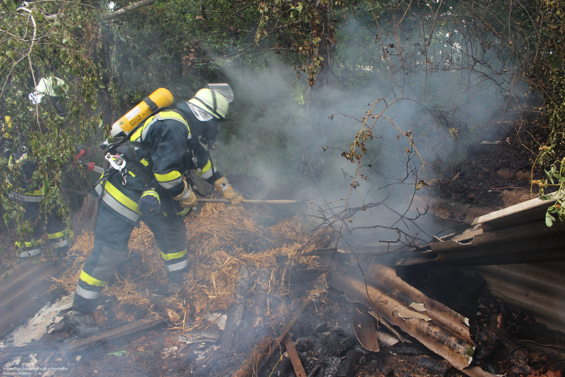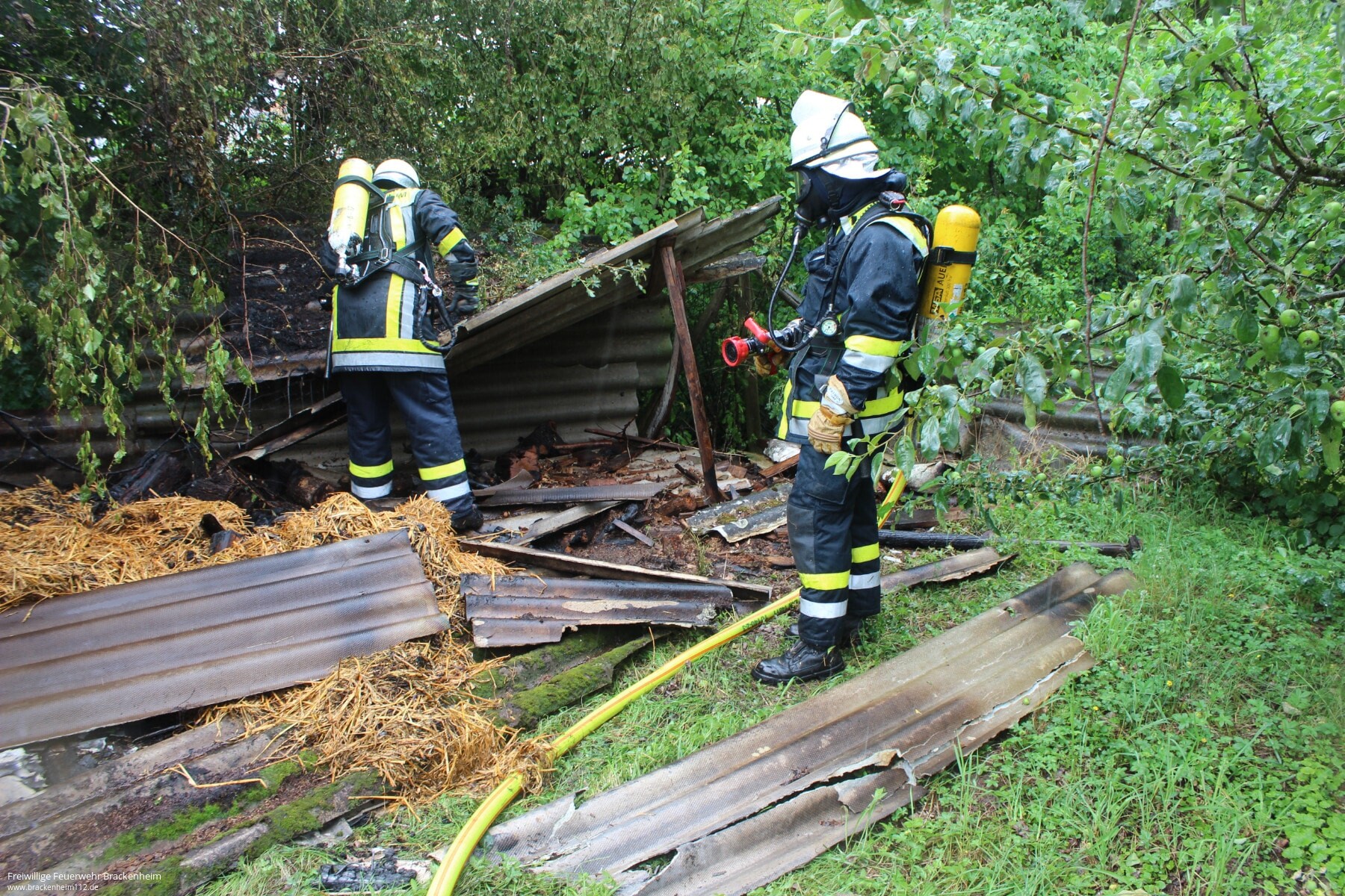 Mit einem C-Rohr unter Atemschutz wurde der mittlerweile eingestürzte Unterstand und darunter befindliches Stroh und Holz abgelöscht. Zur Wasserversorgung für das TSF-W wurden die wasserführenden Löschfahrzeuge der Abteilung Brackenheim eingesetzt.
