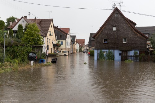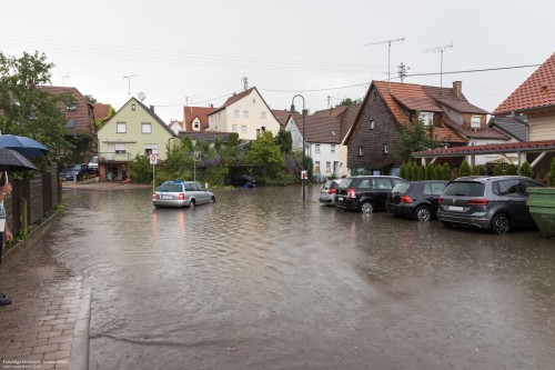 Parallel zu den hauptsächlich überfluteten Kellern, Tiefgaragen und Straßenzügen wurde in Dürrenzimmern ein PKW in einem Bach gemeldet.