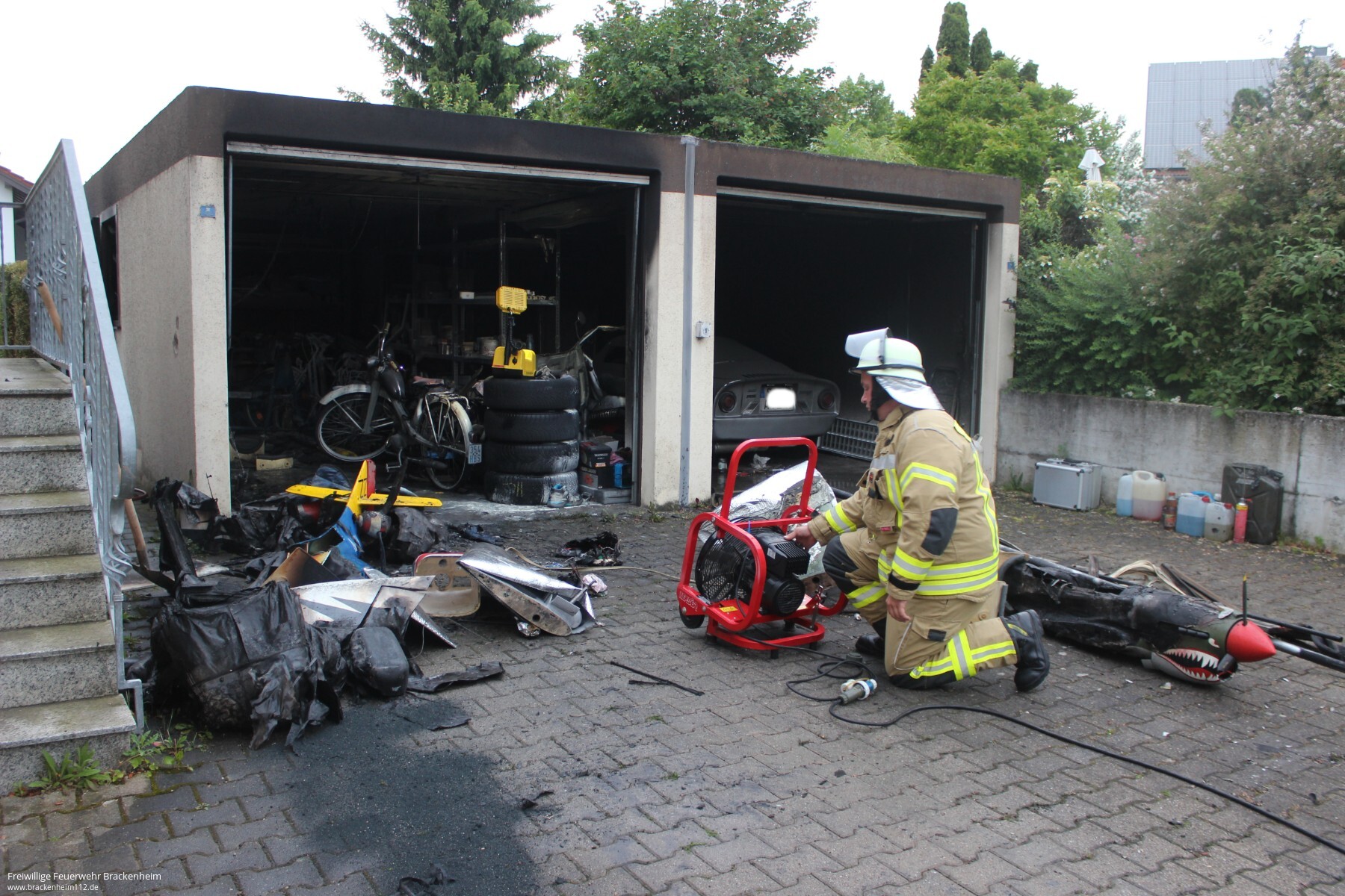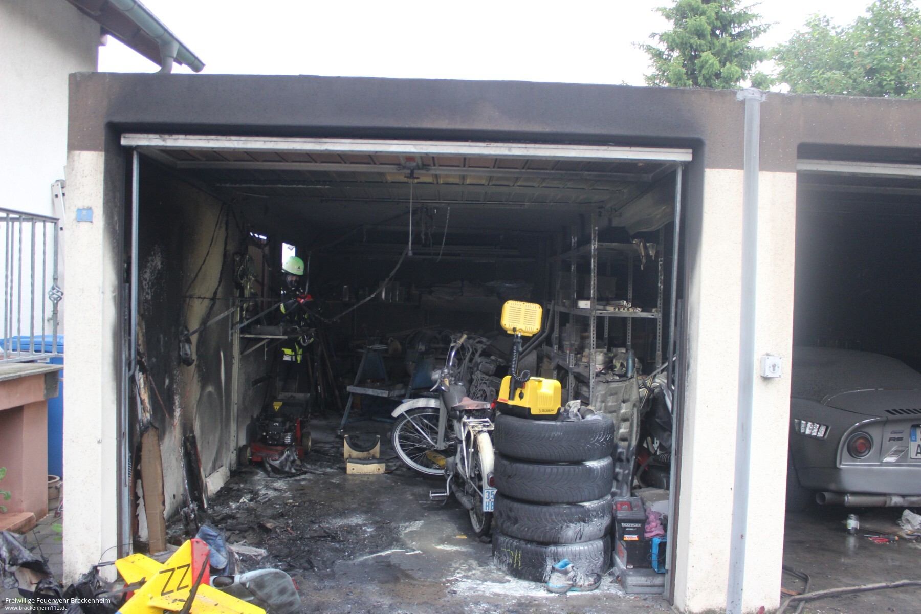 Einsatzkräfte der Abteilung Hausen hatten den Brand schnell unter Kontrolle und konnten somit ein Übergreifen der Flammen auf den abgestellten Oldtimer verhindern. Dennoch entstand laut Polizei ein Sachschaden von ca. 50.000 Euro.