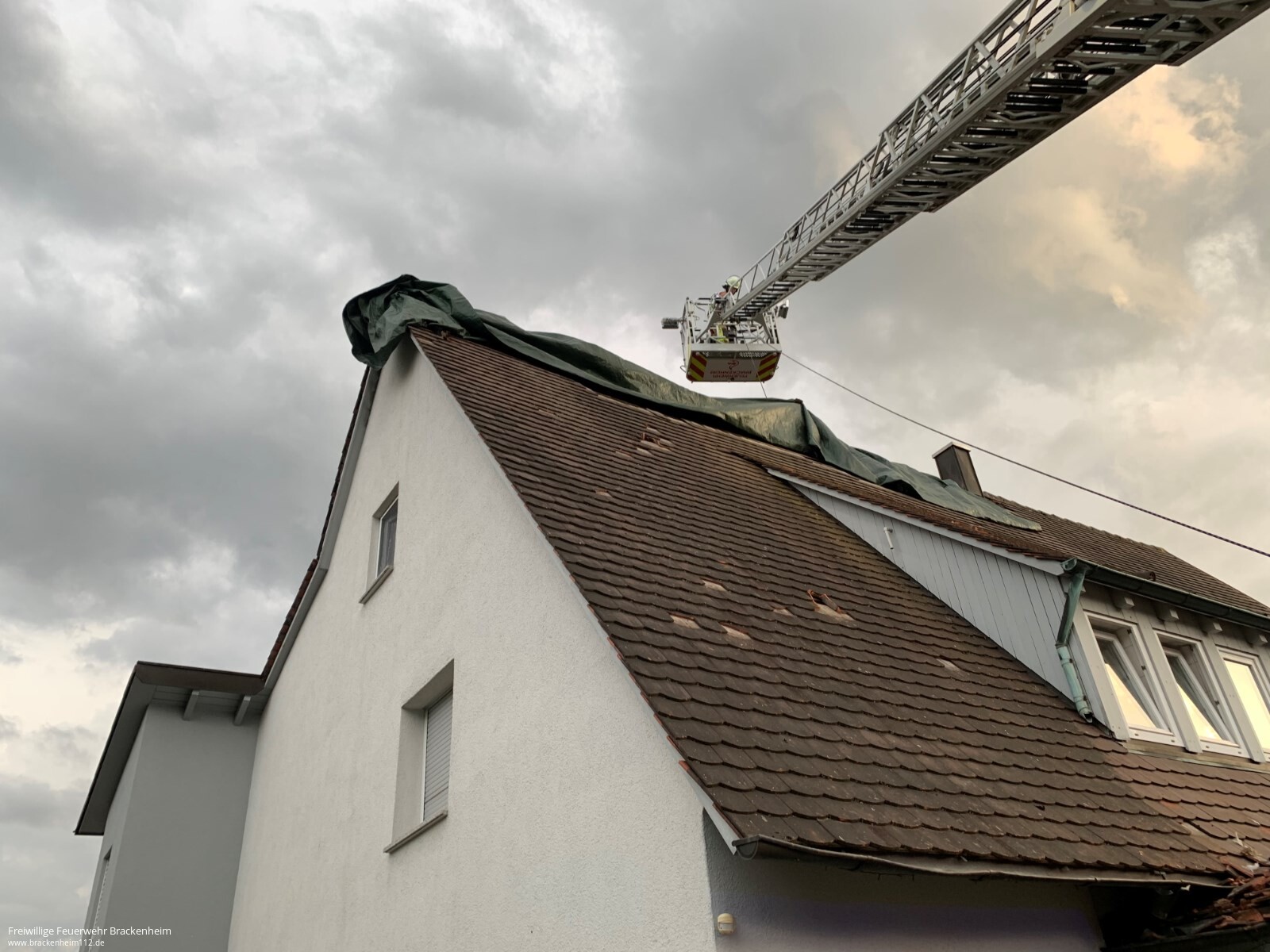 Nach der Überprüfung der Brandstelle mit der Wärmebildkamera wurde das Dach notdürftig mit Planen abgesichert um es für den bereits herannahenden zweiten Gewitterregen des Tages abzudichten.