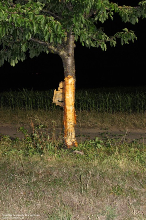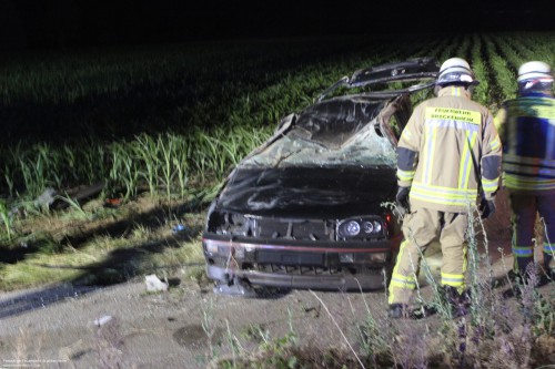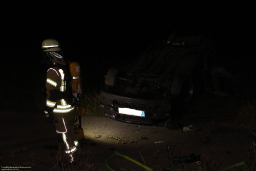 Vor Ort fand man ein neben der Straße auf dem Dach liegendendes Fahrzeug, einen beschädigten Baum und ein größeres Trümmerfeld vor. Der schwerverletzte Fahrer befand sich entgegen erster Meldungen bereits neben seinem Fahrzeug. Somit beschränkte sich die Arbeit auf die Unterstützung des Rettungsdienstes, der Aufnahme von ausgelaufenen Betriebsstoffen, Ausleuchtung für die polizeiliche Unfallaufnahme und in Zusammenarbeit mit dem Abschleppdienst die Reinigung der Unfallstelle.