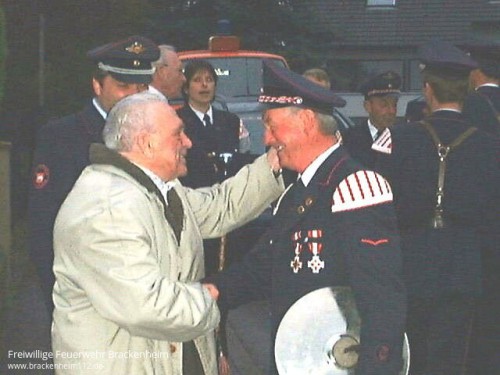 "Glaubst dua, die kommed ieberhabt??" so stand Ehrenmitglied Helmut Apelt am 17.April 2002 gegen 19:40 Uhr am Fenster und wartete, ob sich wenigstens der Kommandant bei sich blicken lassen würde. Immerhin war Helmut Apelt 45 Jahre Gerätewart bei der Wehr in Brackenheim. Doch angekündigt hatte sich niemand. Oder kommt doch vielleicht eine Abordnung mit der Drehleiter vorbei und macht ihm zu seinem 80.ten Wiegenfeste eine kleine Aufwartung?