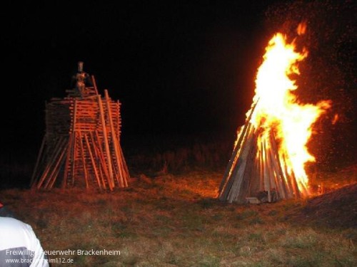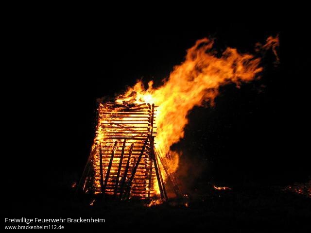 Nachdem der erste Stapel niedergebrannt war, machte sich Oberbrandmeister Markus Zeyer mit seinen Kameraden daran, den auf fast 4 Meter aufgeschichteten, zweiten Hauptstapel zu entzünden. Der auf dem Stapel thronenden Puppe wurde es relativ schnell sehr warm unterm Hintern. Der Kreis der Anwesenden wurde sprichwörtlich immer größer, da die Wärmeentwicklung um diesen Riesenstapel auch immer stärker wurde.