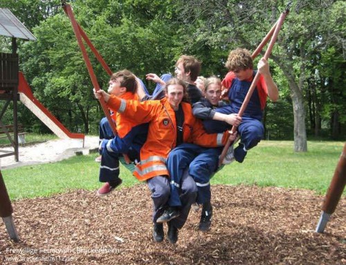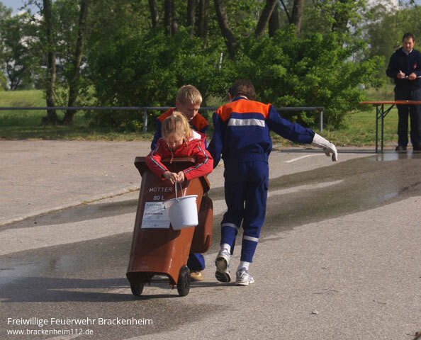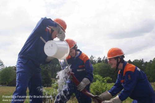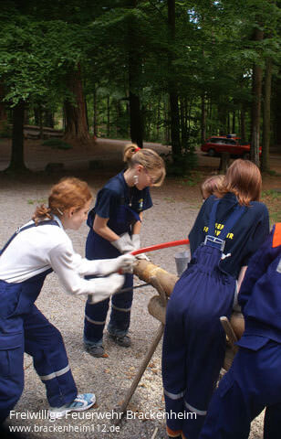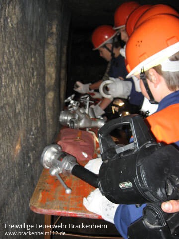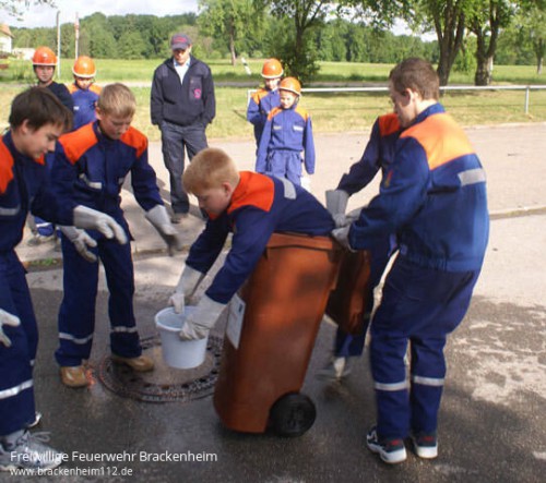 Welche Institution wurde in Wüstenrot gegründet?, wie lautet der lateinische Name des Mammutbaumes? oder wann wurde der Aussichtsturm auf dem Steinknickle erbaut?, das waren die Fragen, die es zu beantworten galt. Doch nicht nur Wissen war gefragt. Allerhand Stationen mussten angelaufen werden. So sägte man im Wald mit einer Handsäge Brennholz zu handlichen Stücken zusammen und erkundete den Silberstollen. In diesen Stollen galt es ausgerüstet mit Handscheinwerfern und Helmen einzusteigen und dessen Schätze zu ergründen. Diese Schätze waren wie sollte es denn bei Jungfeuerwehrleuten denn anders sein Feuerwehrgeräte. Auf der Laufstrecke durch die Teilorte Wüstenrot und Neuhütten waren noch viel mehr Herausforderungen zu finden. Hauptsächlich ging es um das Problem, Wasser von A nach B zu befördern. Kein Hydrant weit und breit, es musste also schon etwas besonderes sein. Man versuchte es mit Wasserbomben, die am Dorfbrunnen gefüllt werden, Biomülltonnen oder Schwämmen. Schlussendlich stellte sich aber der gewohnte Weg durch den Feuerwehrschlauch als bester heraus. Also mit einem Eimer das Wasser in den Schlauch gekippt und geschaut was am anderen Ende heraus kommt auch nicht sehr viel. Für einen Löscheinsatz auf ein kleines Feuer hätte es aber sicher ausgereicht.