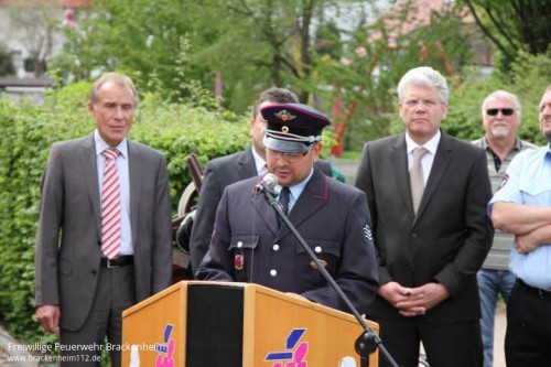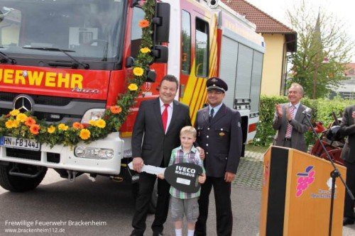 Das Highlight am diesjährigen Tag der offenen Tür war aber sicherlich die offizielle Übergabe des neuen Hilfeleistungslöschgruppenfahrzeugs (kurz: HLF) 20/16. Zwar wurde das Fahrzeug bereits vor mehreren Wochen von der Feuerwehr beim Hersteller abgeholt und seither die Mannschaft in unzähligen Übungsabenden eingewiesen, doch zur offiziellen Übergabe am Tag der offenen Tür waren neben Bürgermeister Kieser und Kommandant Hügle auch jeweils ein Vertreter der Daimler AG und dem Aufbauhersteller Magirus Brandschutztechnik GmbH sowie der stellv. Kreisbrandmeister Schiefer aus Lauffen a.N. anwesend. Nach jeweils kurzen Redebeiträgen stand die symbolische Schlüsselübergabe des Fahrzeugs an: Der Schlüssel wurde dieses Mal aber nicht wie üblich an die Feuerwehr bzw. stellvertretend an den Kommandanten übergeben, sondern als Zeichen dessen, dass es sich bei dem Fahrzeug nicht um ein Geschenk an die Feuerwehr, sondern um ein Rettungsmittel für alle Bürgerinnen und Bürger unserer Stadt handelt, an einen jungen Menschen aus Brackenheim. Vielleicht wird er mit diesem Fahrzeug in einigen Jahren selbst als Mitglied unserer Feuerwehr anderen Menschen in Notlagen helfen und/oder in 30 Jahren für den Ersatz dieses Fahrzeugs sorgen, so Kommandant Hügle in seinen Dankesworten. In jedem Fall wird das Fahrzeug zukünftig wesentlich zur Leistungsfähigkeit der Freiwilligen Feuerwehr Brackenheim beitragen.