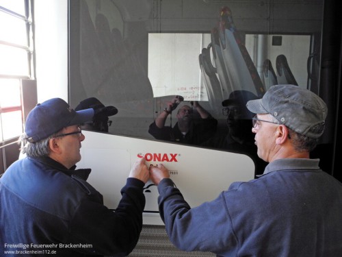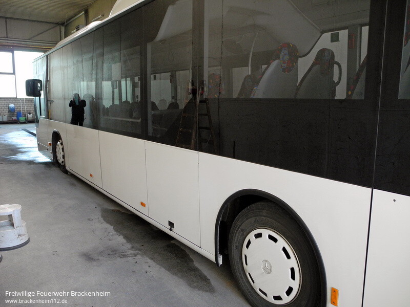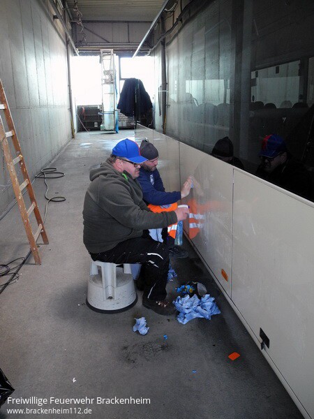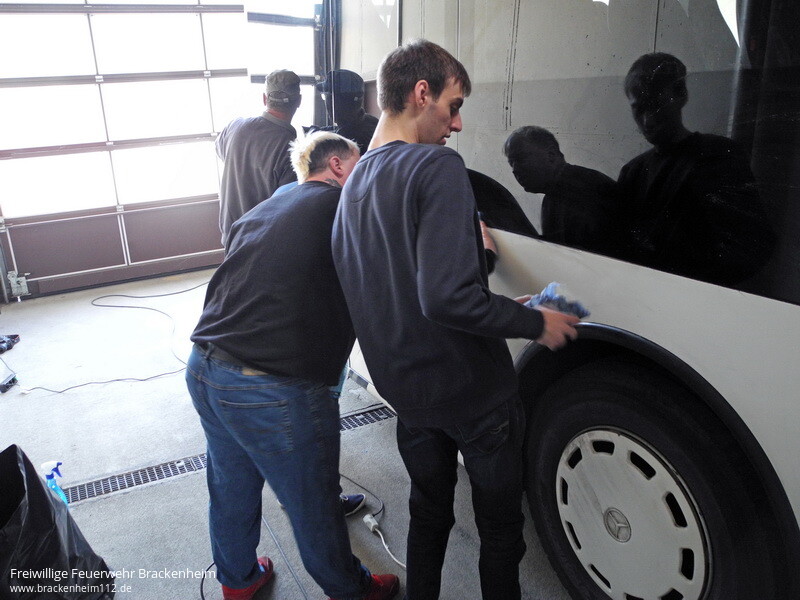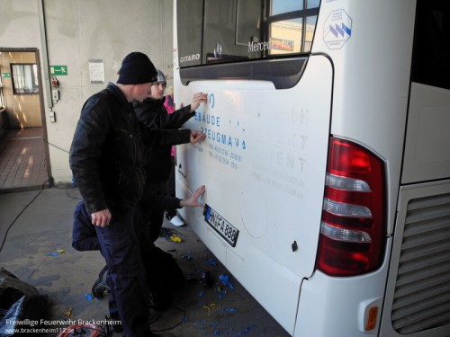 Frohen Mutes und voller Tatendrang begann man, ausgestattet mit Heißlüftföhnen, Kunststoffspachteln, "Fingernägeln" und entsprechendem Reiniger, die Beklebung des Busses zu entfernen. Für eine fachgerechte Einweisung sorgte Herr Kühner von der Fa. Fokina. Nach rund 2 Std. hatte man die komplette Beklebung und die Kleberückstände mit speziellem Reiniger entfernt. Groß war die Freude da es schneller ging als man erwartet hatte. Da gute Arbeit nur mit der entsprechenden Verpflegung möglich ist, hatte Axel Klumbach von der Feuerwehr Bad Rappenau für diese gesorgt.