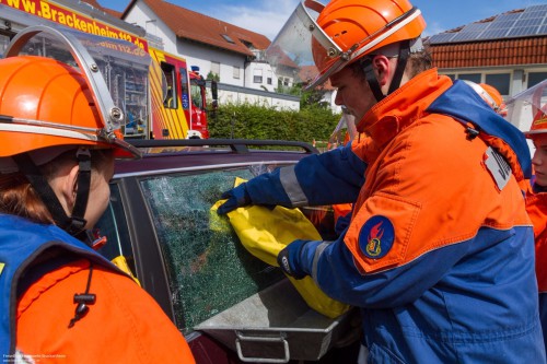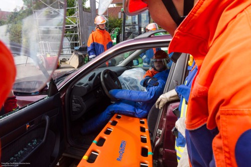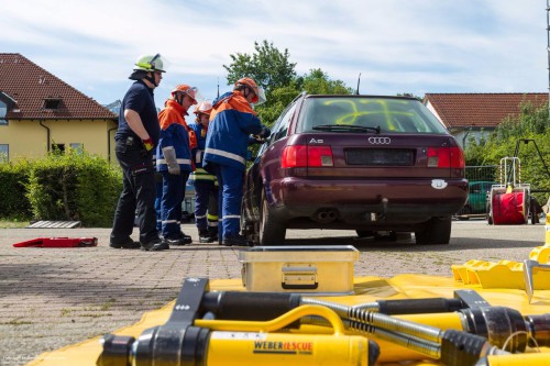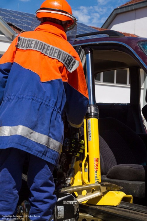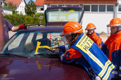 Danach folgte eine knappe Stunde Gerätekunde, bevor es ans Fahrzeug ging. Zuerst wurde geübt, wie man das Fahrzeug richtig absichert und stabilisiert, danach folgte das Glasmanagement bevor anschließend eine Übungspuppe aus dem Fahrzeug gerettet werden musste. Die Jugendlichen durften sich dann noch mit Halligan-Tool und Brecheisen versuchen und haben schnell festgestellt, wie schwer es damit fällt eine Autotür zu öffnen.