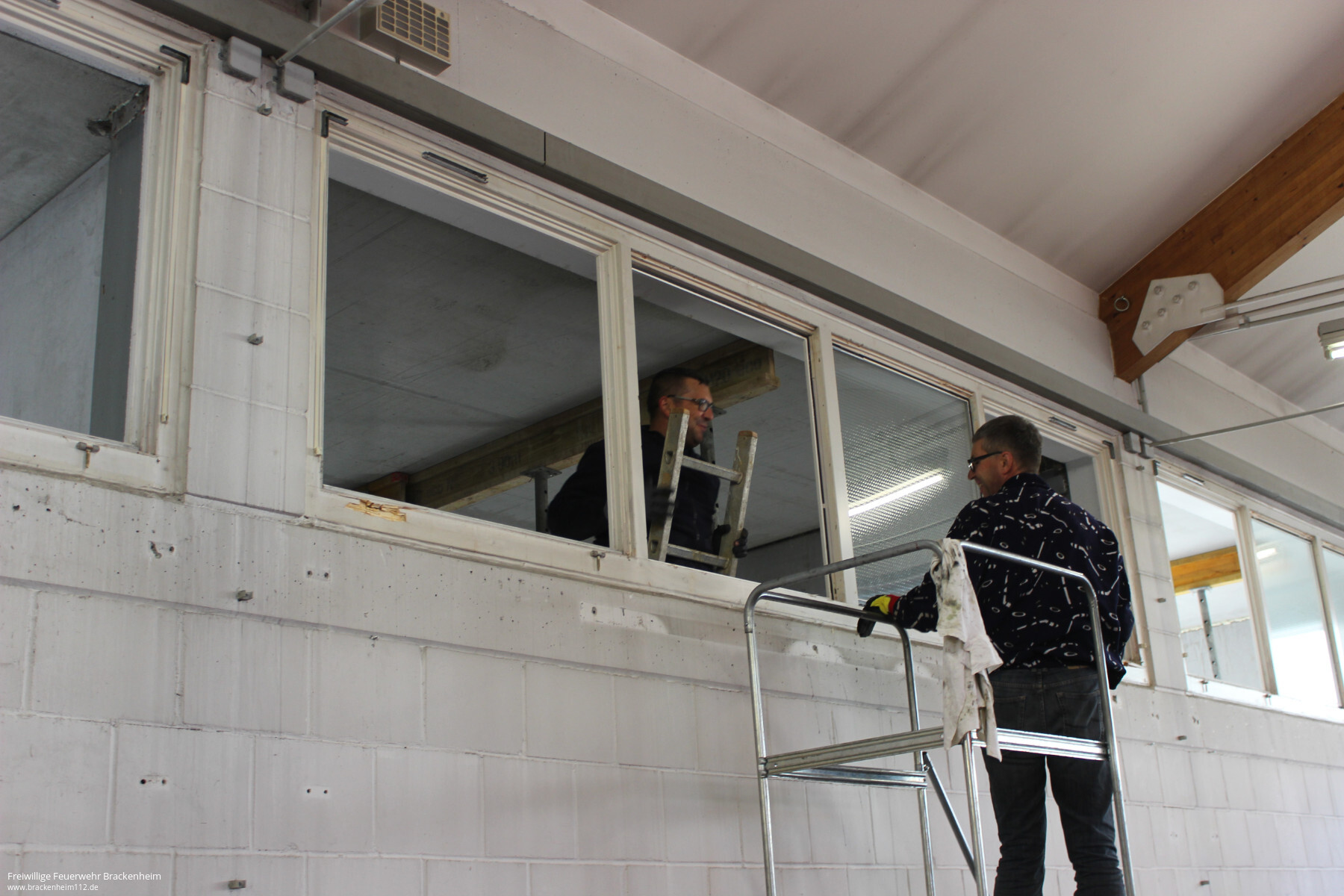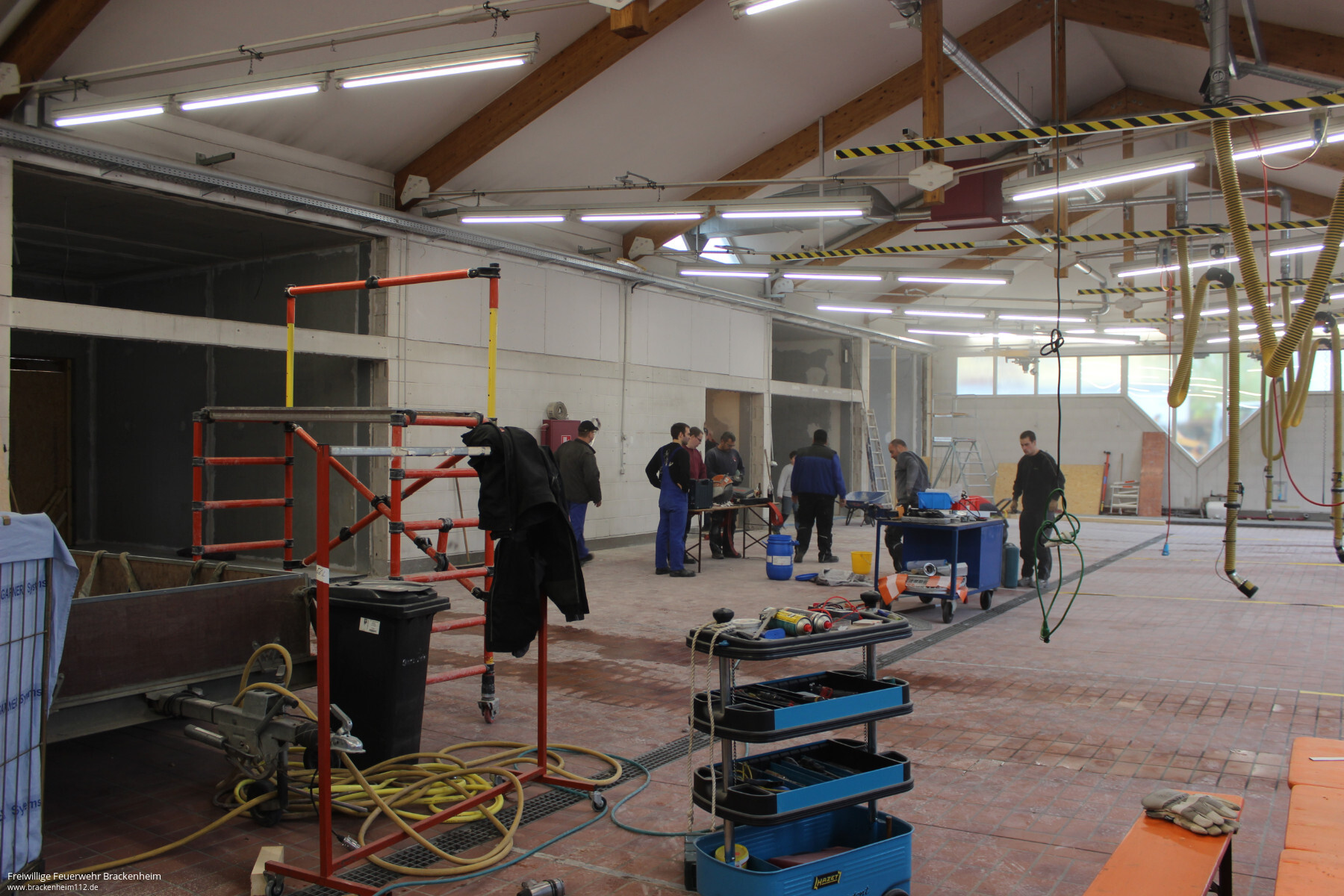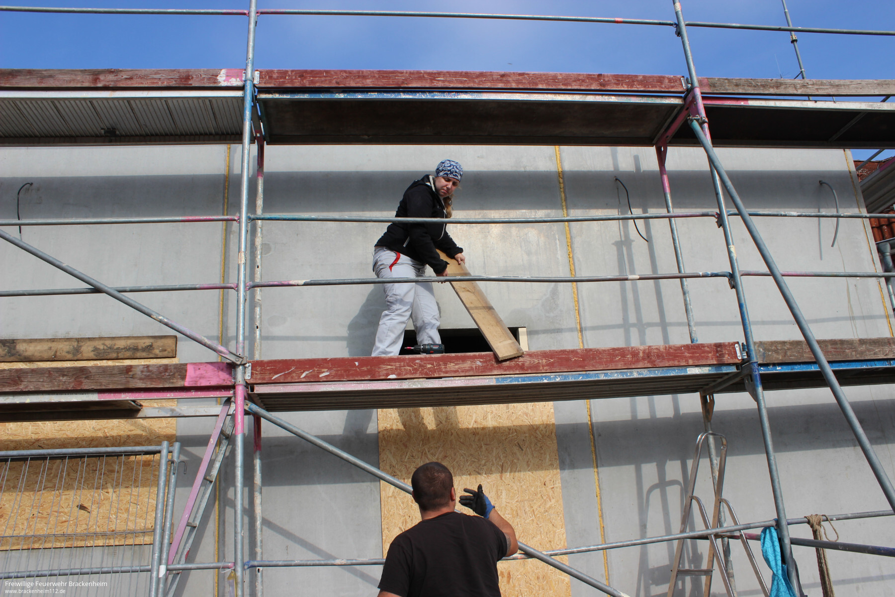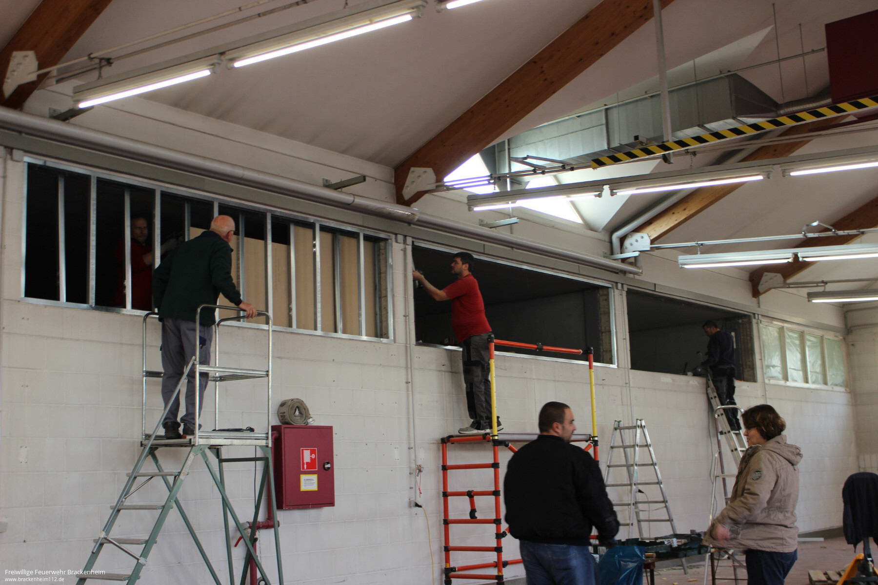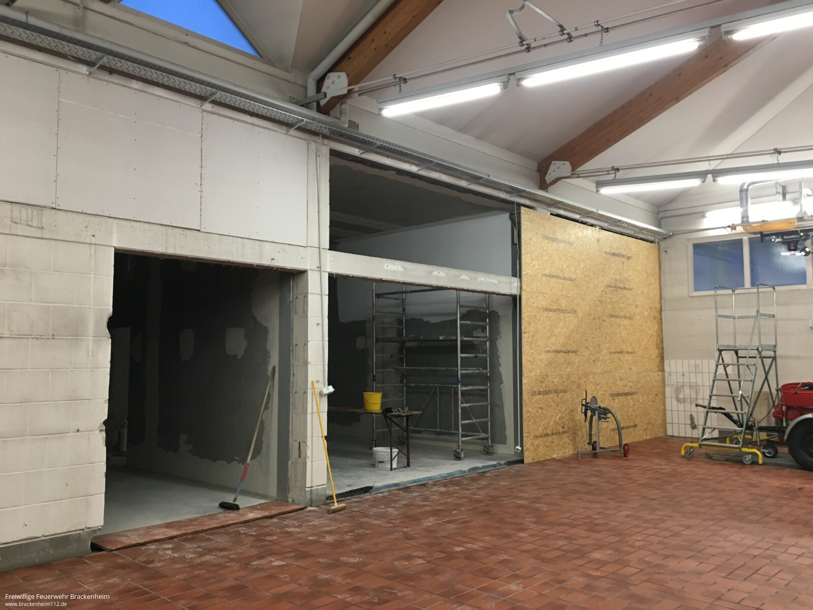 Wer in den letzten Wochen, vor allem an den Samstagen, beim Brackenheimer Feuerwehrgerätehaus vorbeischaute stieß auf ein reges Treiben. Nachdem der Rohbau des rückwärtig an die Fahrzeughalle angebauten Neubaus stand konnten die mit der Stadt vereinbaren Eigenleistungen begonnen werden. Diese umfassen hauptsächlich die Durchbrüche zum Bestandsgebäude, Einbau von Zwischenböden zur Lagerung, Elektroinstallation, Heizungs- und Sanitärinstallation sowie Malerarbeiten. Um die Arbeiten auch vor dem Einbau von Fenstern, Türen und Toren beginnen zu können wurde zusätzlich die provisorische Verschalung der Gebäudeöffnungen übernommen.