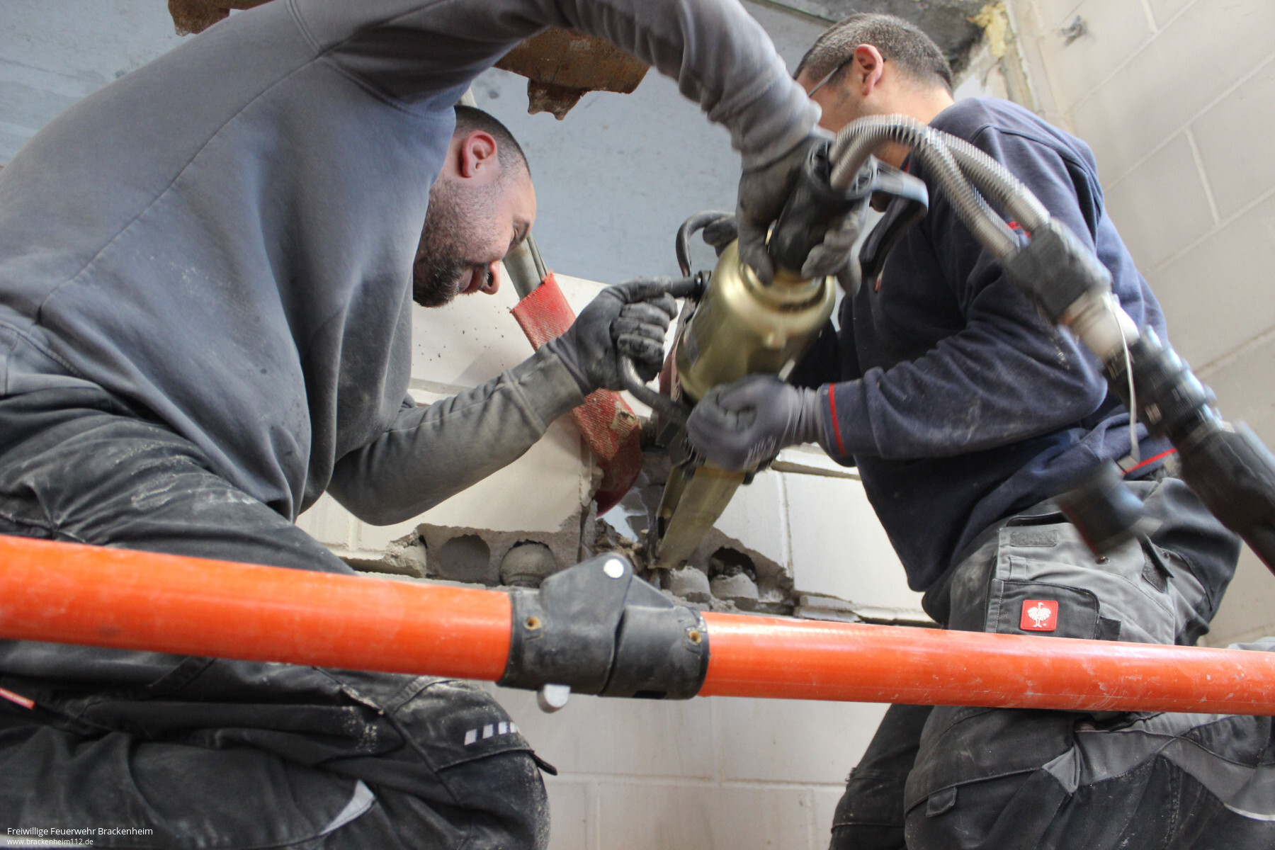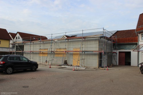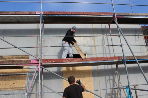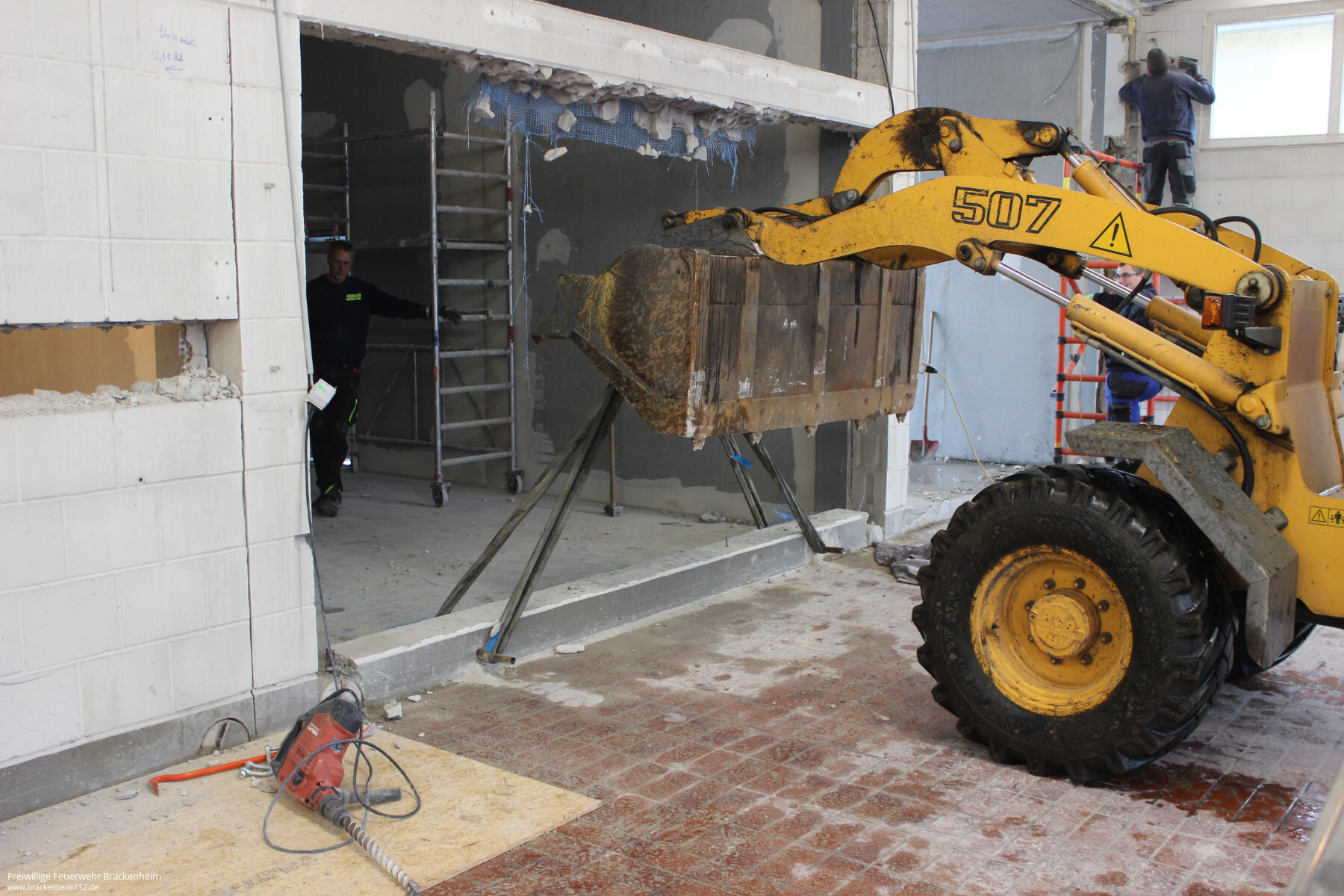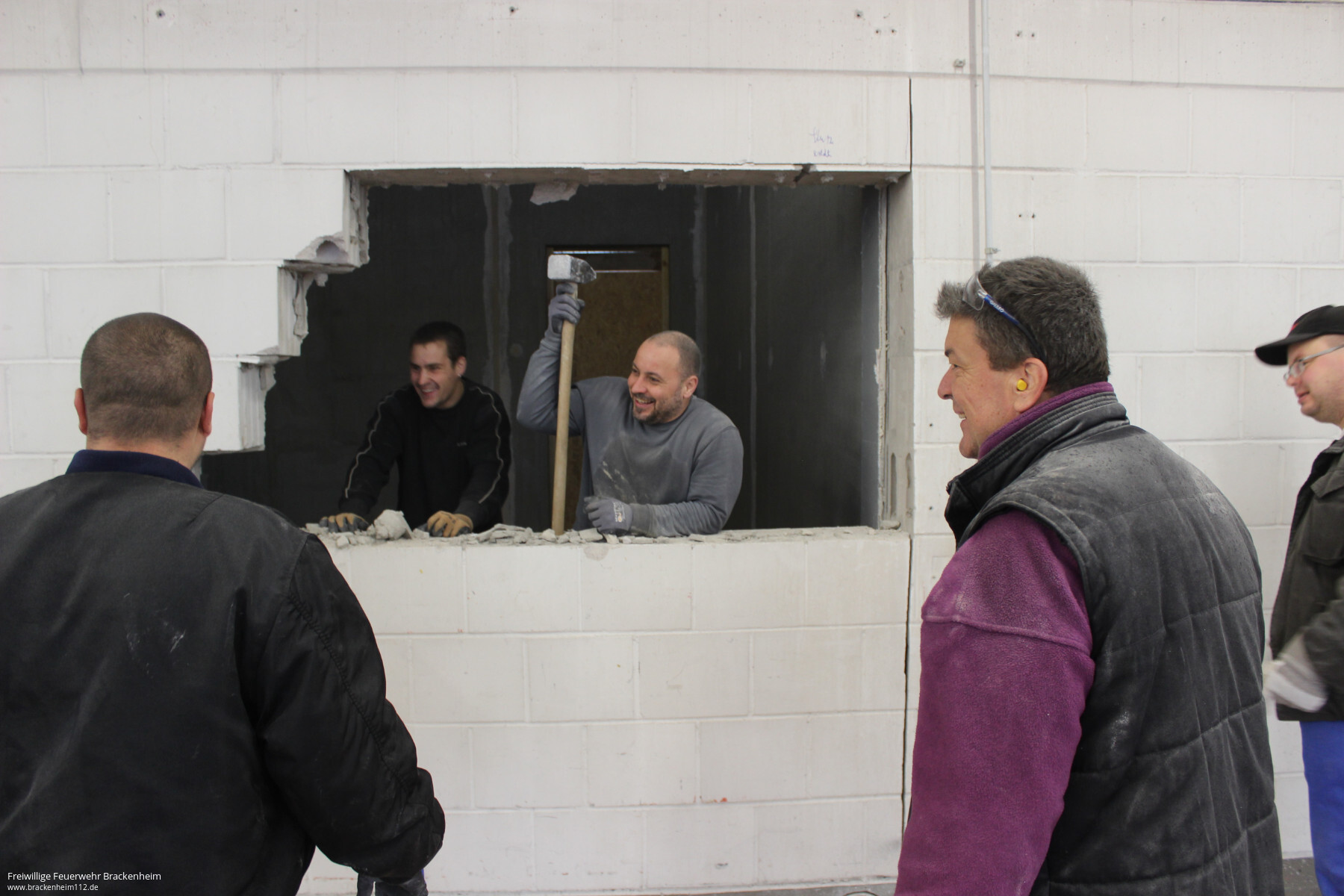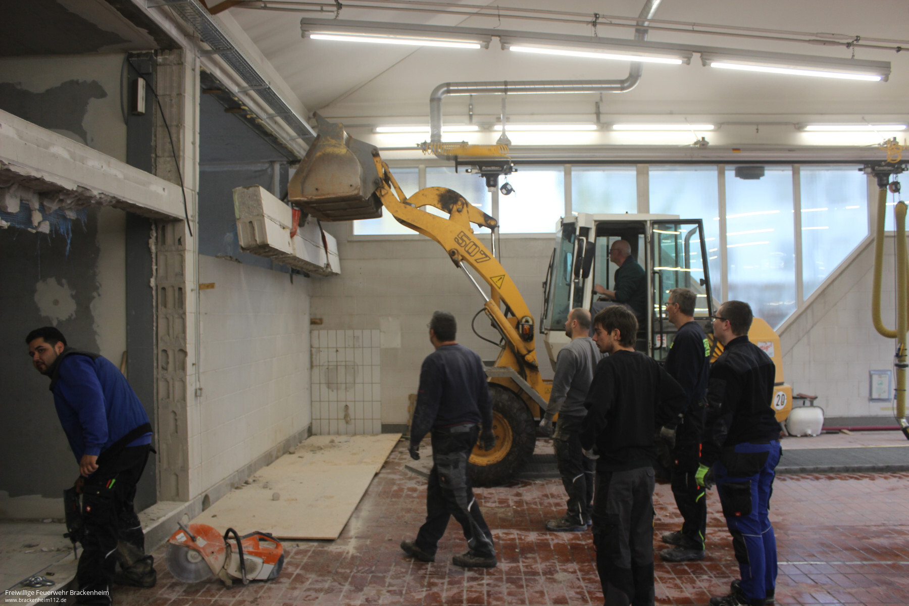 Wer in den letzten Wochen, vor allem an den Samstagen, beim Brackenheimer Feuerwehrgerätehaus vorbeischaute stieß auf ein reges Treiben. Nachdem der Rohbau des rückwärtig an die Fahrzeughalle angebauten Neubaus stand konnten die mit der Stadt vereinbaren Eigenleistungen begonnen werden. Diese umfassen hauptsächlich die Durchbrüche zum Bestandsgebäude, Einbau von Zwischenböden zur Lagerung, Elektroinstallation, Heizungs- und Sanitärinstallation sowie Malerarbeiten. Um die Arbeiten auch vor dem Einbau von Fenstern, Türen und Toren beginnen zu können wurde zusätzlich die provisorische Verschalung der Gebäudeöffnungen übernommen.
