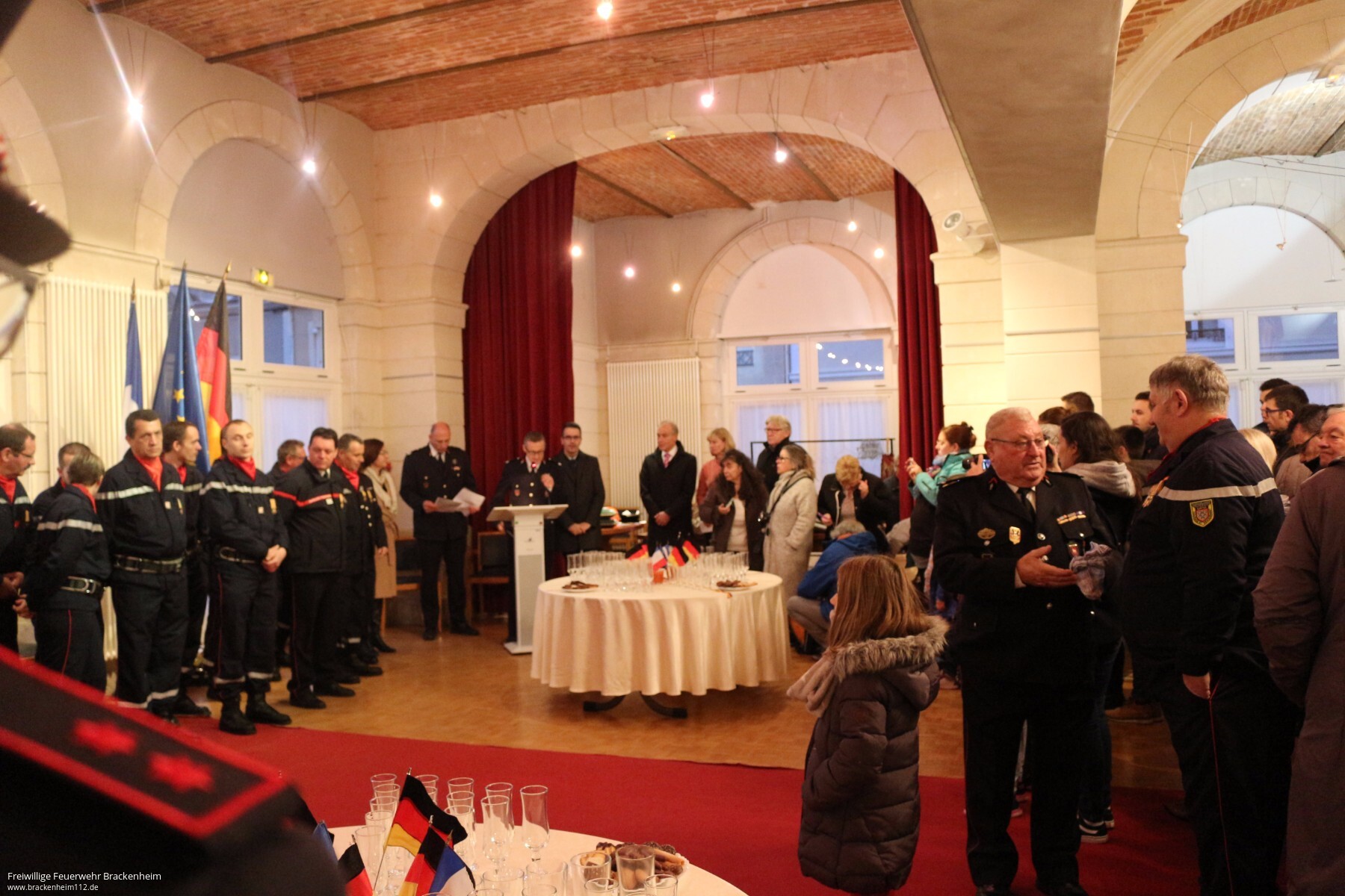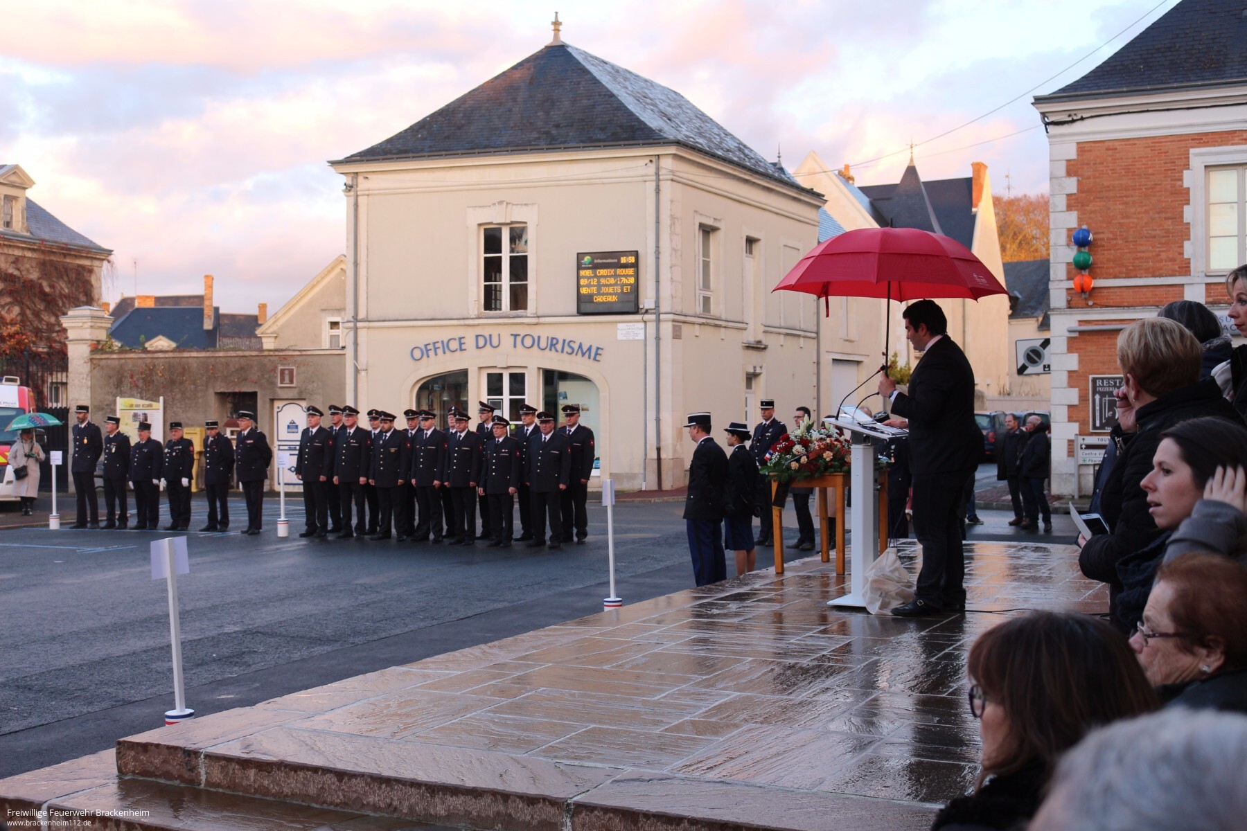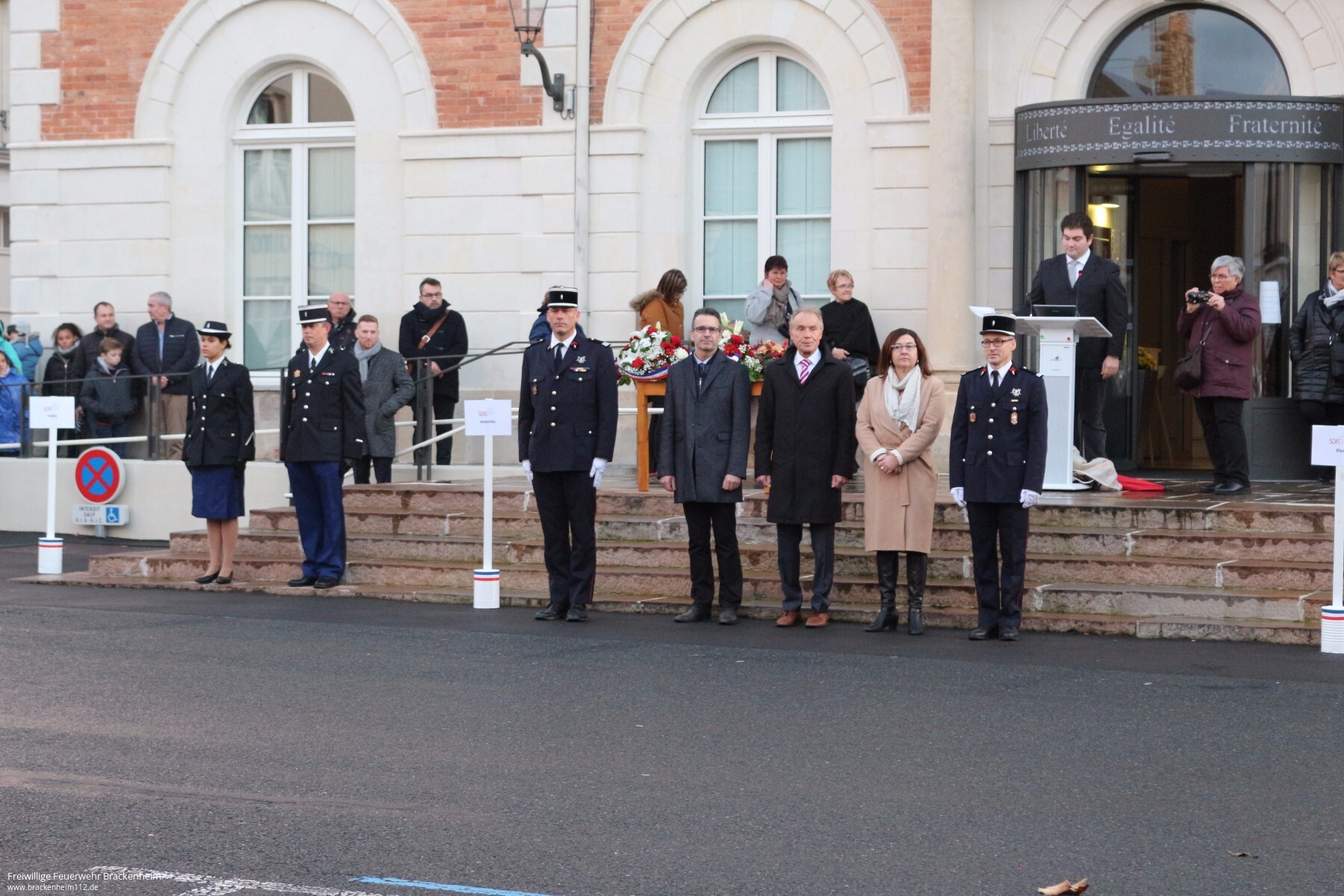 Nach dem der nächste Morgen bei den Gastfamilien verbracht wurde ging es am Nachmittag auf den Rathausplatz. Hier wurde gemeinsam das Saint Barbe Fest gefeiert. Dabei gedenken die französischen Feuerwehrleute in einer förmlichen Zeremonie ihren verstorbenen Kameraden und ehren anschließend die zur Beförderung anstehenden Kameraden im Beisein der Bevölkerung. Für alle gab es danach einen Stehempfang im Rathaus, wo auch Herr Kieser die Grüße aus Brackenheim seiner Kollegin Béatrice Latouche in einer kurzen Ansprache übermittelte.