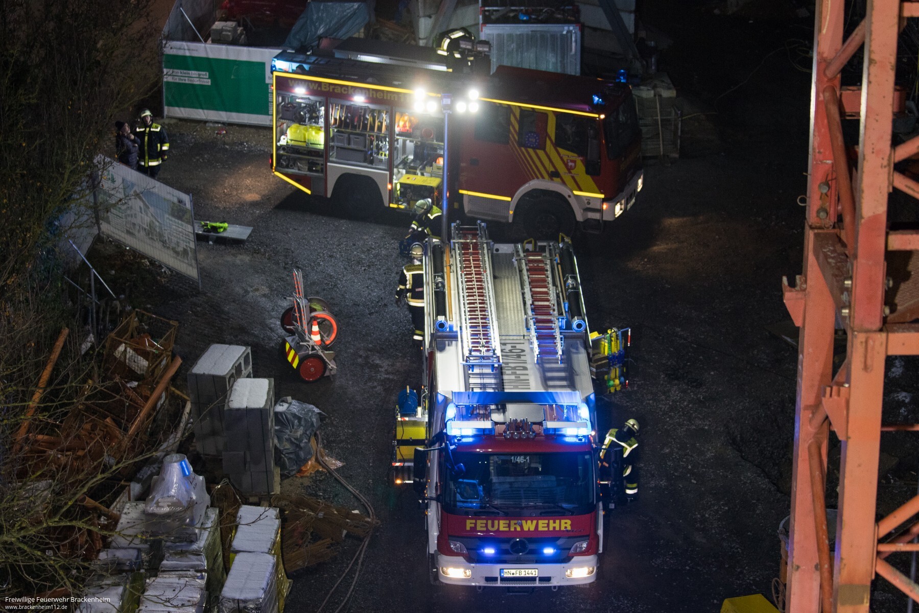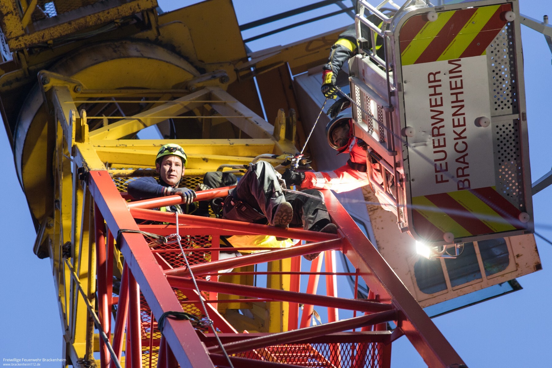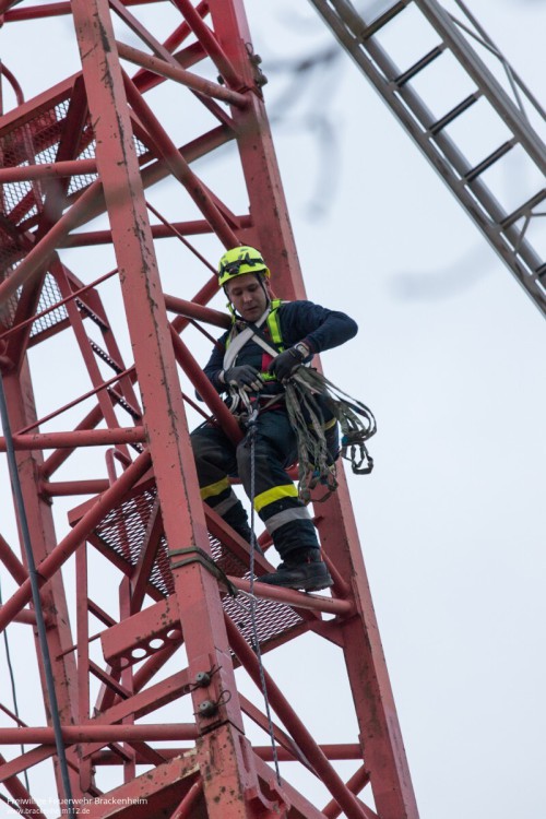 Die Feuerwehr Brackenheim ist wenige Minuten später mit mehreren Einsatzfahrzeugen unter Führung ihres Kommandanten Peter Hügle vor Ort. Nach kurzer Klärung des Sachverhaltes wird das Drehleiterfahrzeug positioniert. Zeitgleich erfolgt schon der gesicherte Aufstieg eines Feuerwehrmannes auf der Außenseite des Kranmastes.