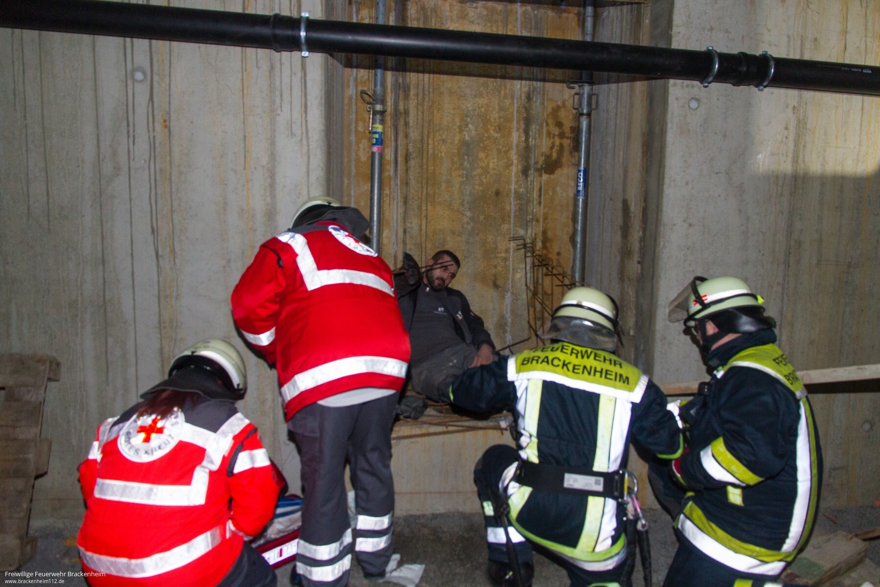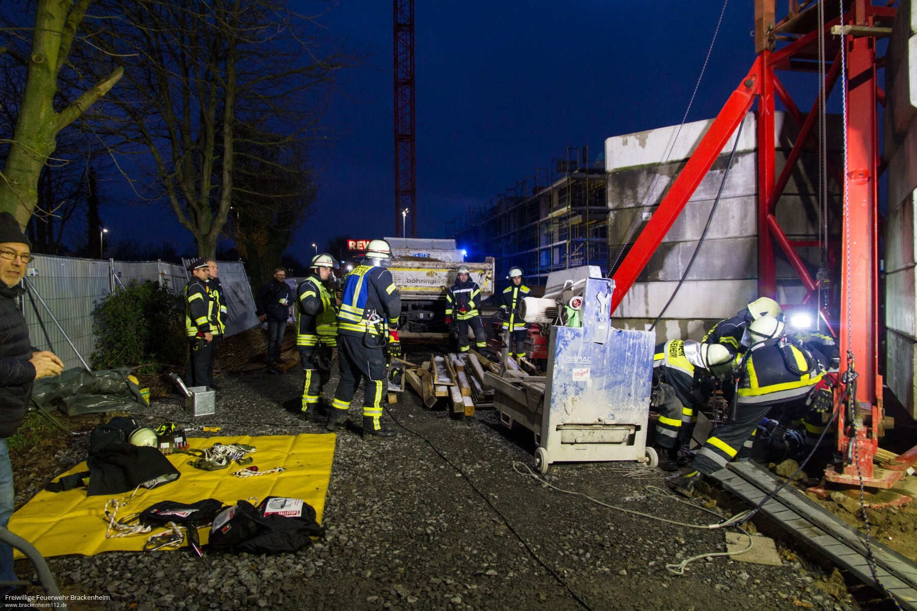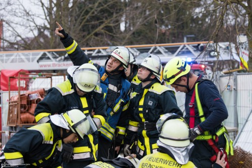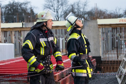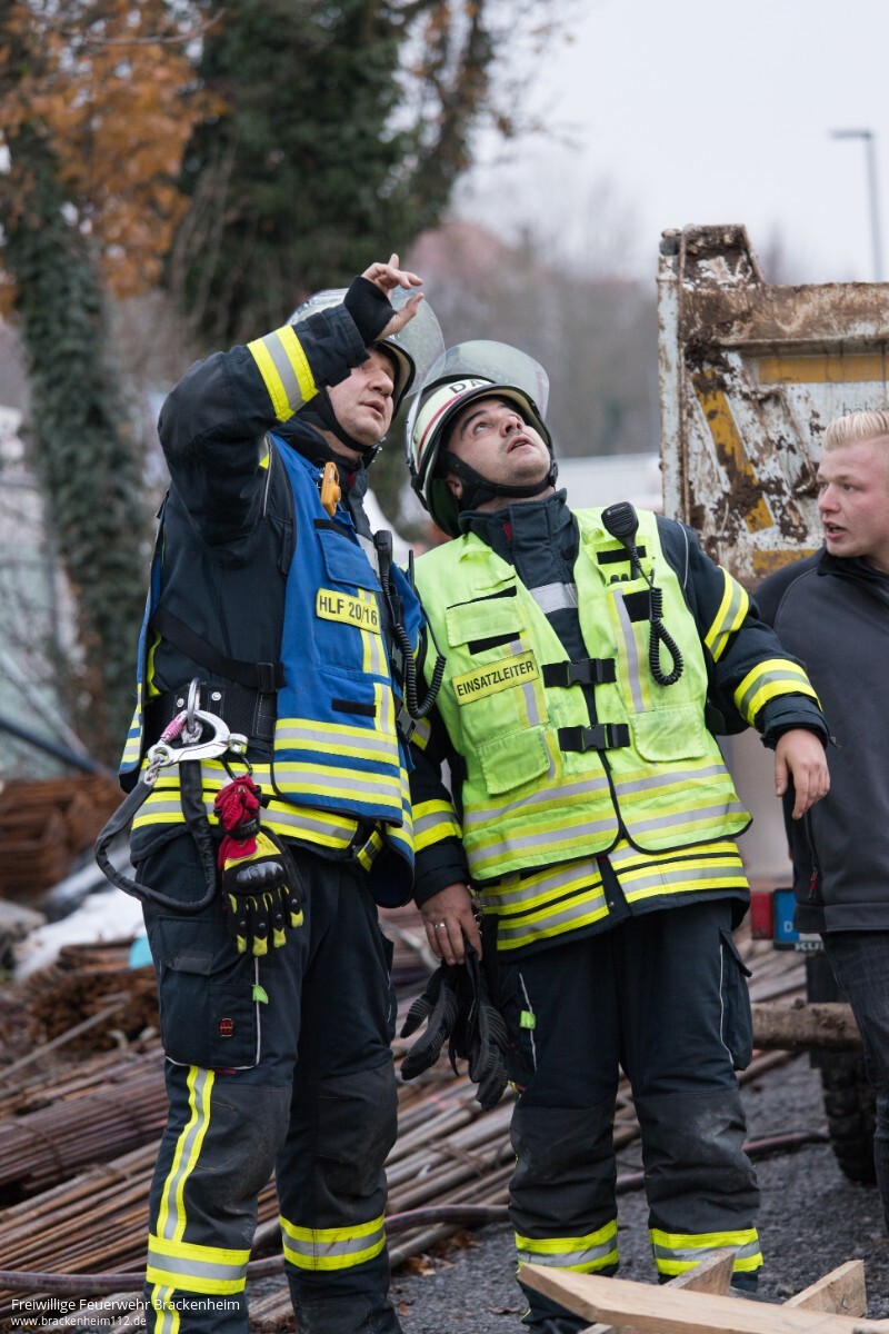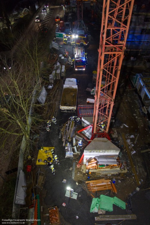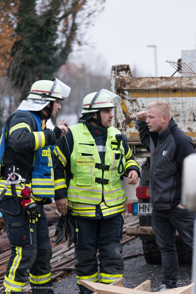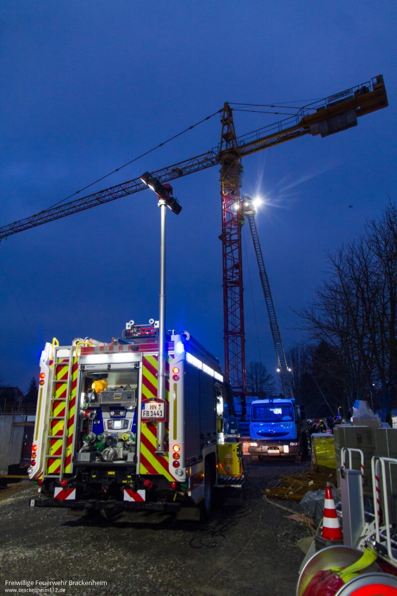 Es ist kurz vor Feierabend am Samstagnachmittag auf der Großbaustelle der Firma Creativbau Böhringer auf dem Bleyle-Areal in Brackenheim, als der Kranführer aus seiner Gondel steigt, auf der Leiter abrutscht, auf ein Podest innerhalb des Gittermasten fällt und dort verletzt liegen bleibt. So lautet das Übungsszenario der Feuerwehrübung. Die "Hilfeschreie" werden von Kollegen gehört, die sofort die Notrufzentrale verständigen. Von dort aus werden Feuerwehr und Rettungsdienst alarmiert und zur Unfallstelle beordert.