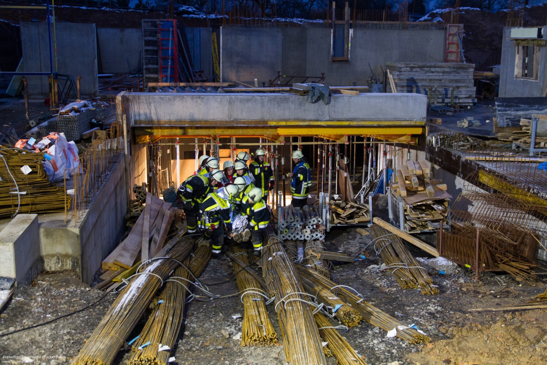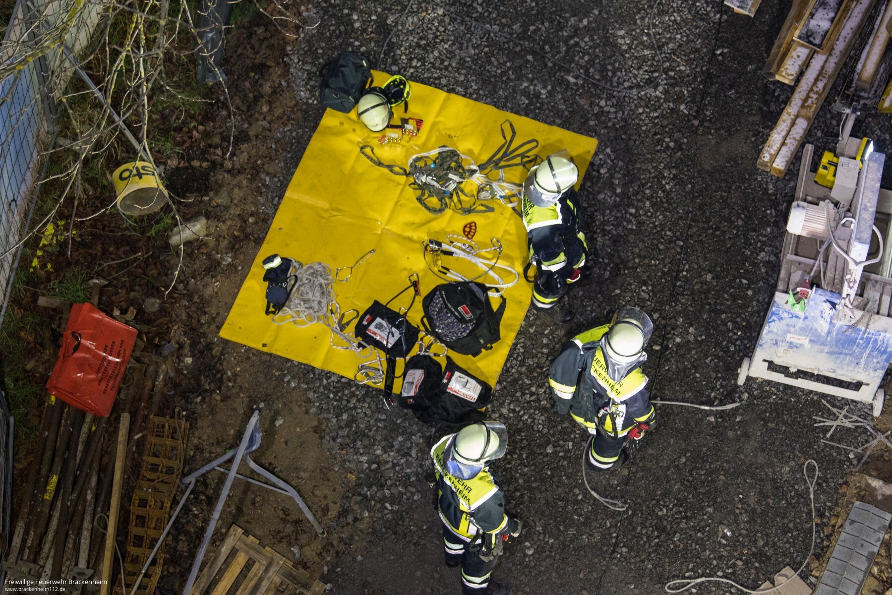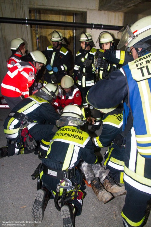 Das "Abseilen" des Verletzten verläuft dann auch schnell und sicher. Die Person kann zur weiteren Behandlung ins Krankenhaus verbracht werden. Während der Rettung des Kranführers ist es innerhalb der Baustelle zu einem weiteren "Unfall" gekommen. Ein Arbeiter ist in der Dunkelheit einen Schacht hinuntergestürzt. Auch er ruft um Hilfe. Die bereits anwesende Feuerwehr kann die Person mit Hilfe einer Wärmebildkamera ausfindig machen und zur Versorgung aus dem Schacht retten.